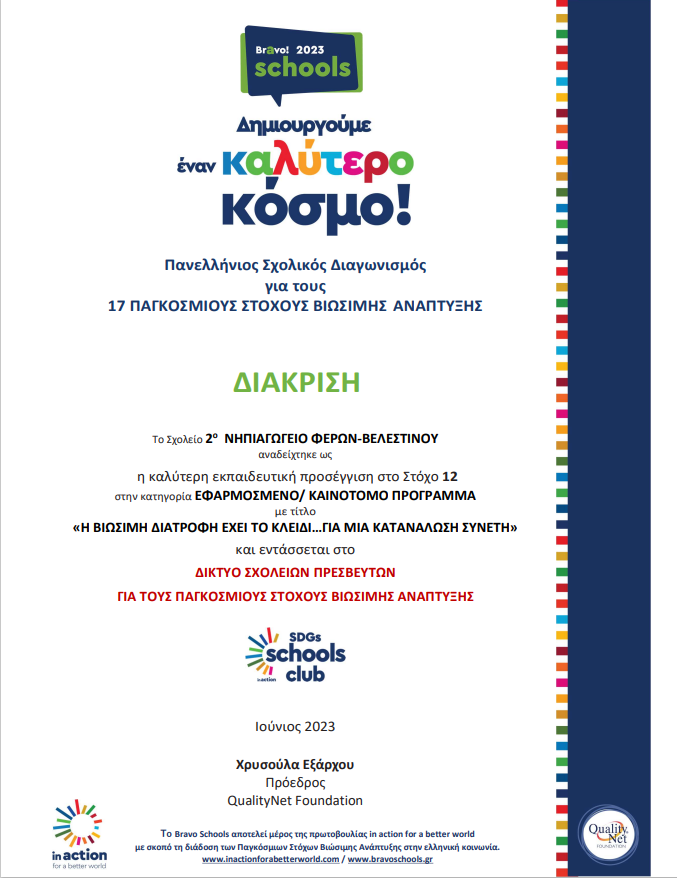 Το Νηπιαγωγείο μας είναι το μοναδικό που έλαβε διάκριση στο νομό Μαγνησίας στον Πανελλήνιο Σχολικό Διαγωνισμό Bravo-Schools 2023, ανάμεσα σε πολλά σχολεία του νομού, που έλαβαν μέρος. Σε επίπεδο περιφέρειας Θεσσαλίας διακρίθηκαν άλλα δύο νηπιαγωγεία.