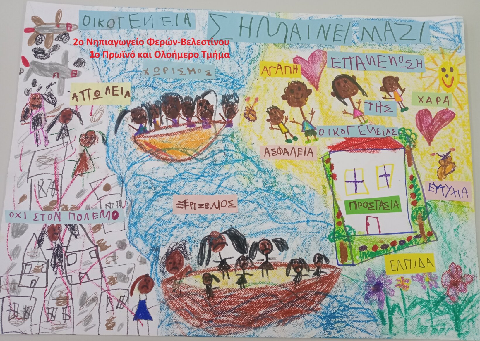 Συζητήσαμε, ανταλλάξαμε απόψεις και ιδέες αποφασίσαμε να δημιουργήσουμε μία αφίσα δίνοντας το μήνυμα: “Οικογένεια σημαίνει μαζί”. Η Αφίσα χωρίζεται σε τρία μέρη. Στο πρώτο μέρος αποτυπώνεται ο πόλεμος, θέλοντας να στείλουμε το μήνυμα ότι πρέπει να σταματήσει ο πόλεμος και η απώλεια και να ξαναέρθει η ΕΙΡΗΝΗ. Στο δεύτερο μέρος ζωγραφίσαμε τον αποχωρισμό από την οικογένειά τους και τον ξεριζωμό από την πατρίδα τους. Στο τρίτο μέρος ζωγραφίσαμε μία χώρα με όμορφα χρώματα και εκφράσαμε την επιθυμία και την ανάγκη να βοηθηθούν όλα τα παιδιά να ξαναβρεθούν με τις οικογένειές τους και να γίνει η επανένωση της οικογένειας. Έτσι, θα ξανανιώσουν κι αυτά χαρούμενα μέσα από την ασφάλεια, προστασία και ανιδιοτελή αγάπη, που προσφέρει η οικογένεια. Να νιώσουν ξανά ελπίδα για τη ζωή. Γιατί οικογένεια σημαίνει μαζί!!!