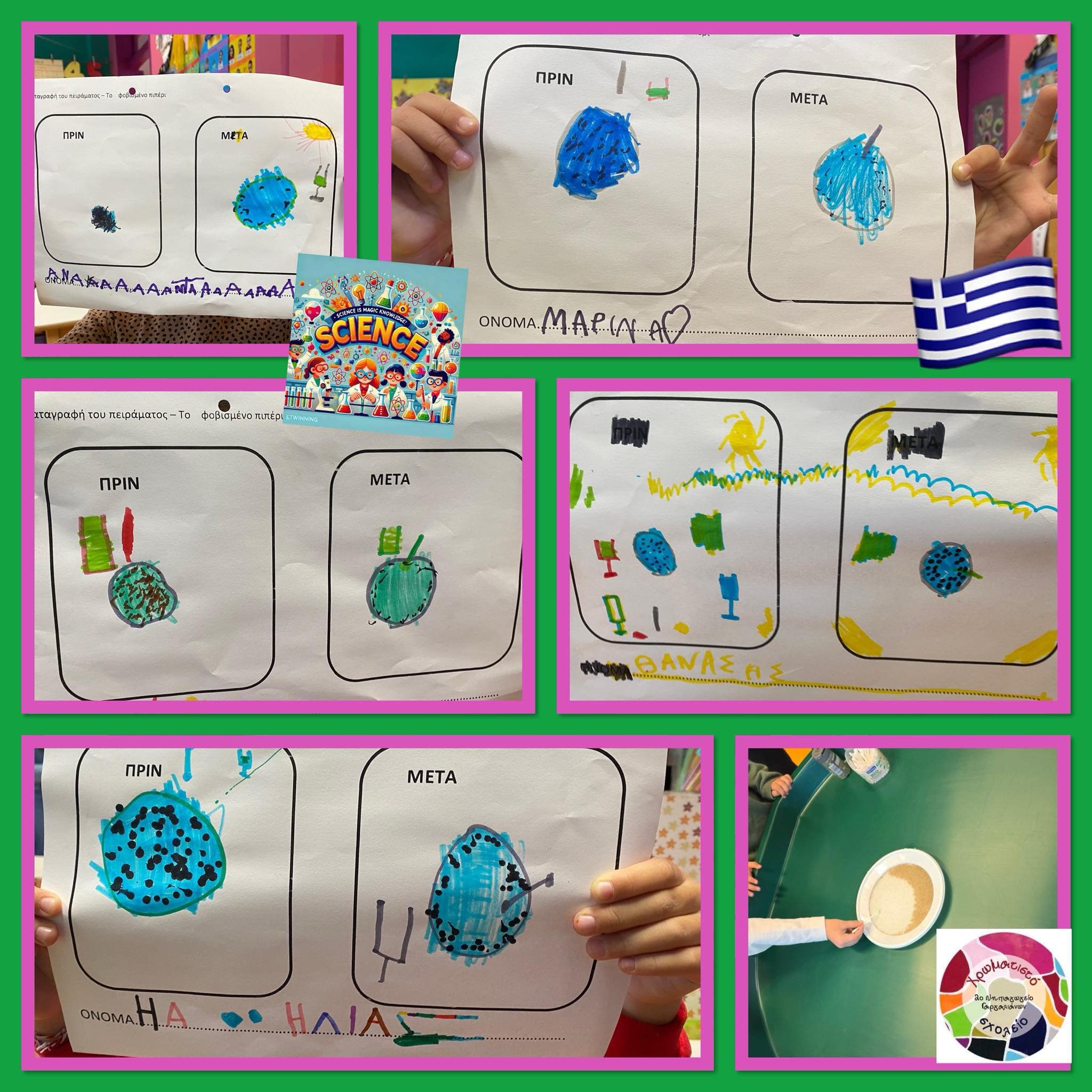 Αφού απολαύσαμε το “μαγικό” μας ουράνιο τόξο, τα παιδιά αποτύπωσαν και αξιολόγησαν όλη τη διαδικασία σε ένα φύλλο χαρτί. Αυτός ήταν ένας σημαντικός τρόπος να καταγράψουμε τις παρατηρήσεις μας και να ελέγξουμε την κατανόηση του πειράματος, μετατρέποντας την επιστημονική μας παρατήρηση σε πολύτιμη γνώση!