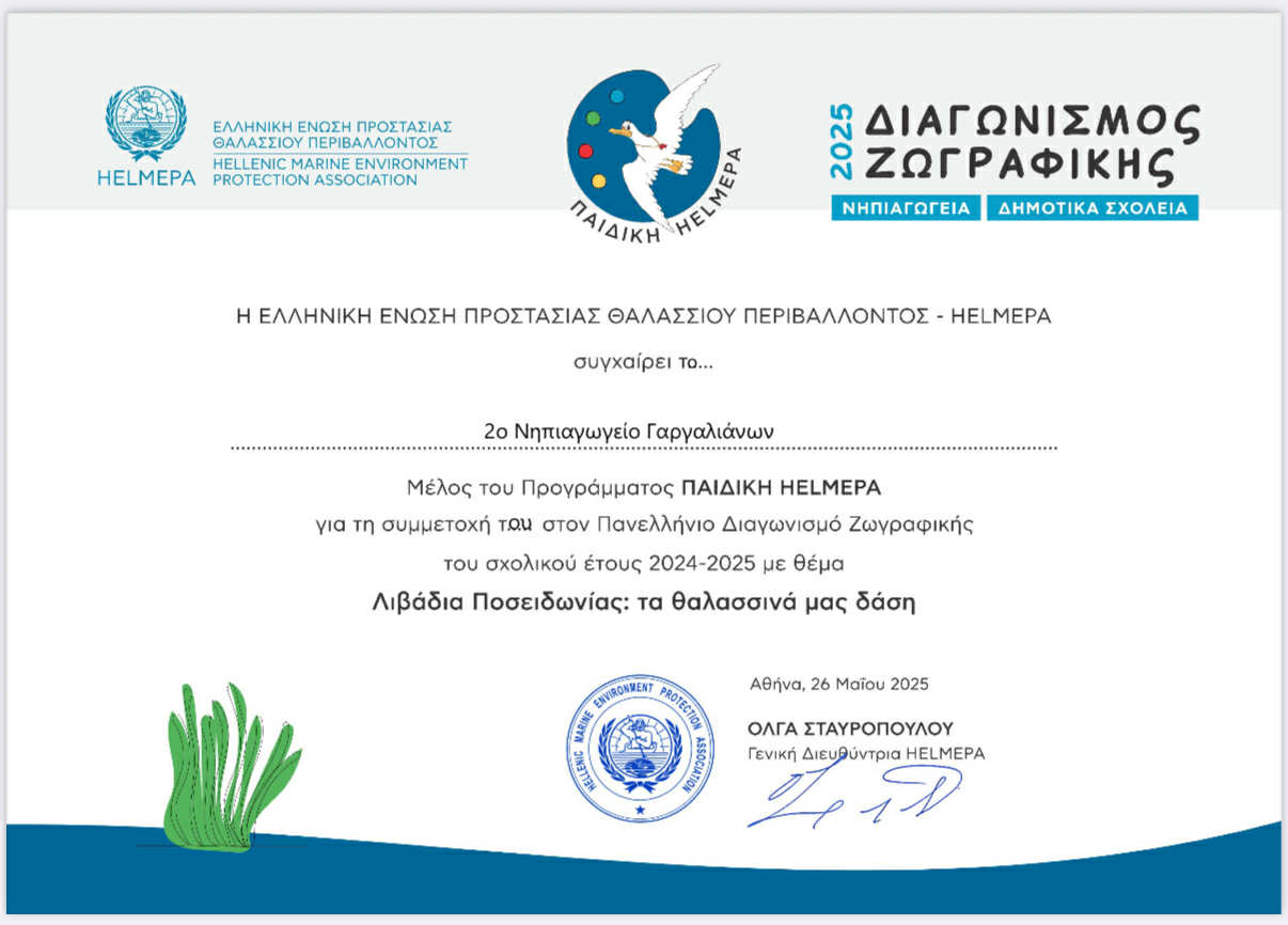 Το νηπιαγωγείο μας και φέτος συμμετείχε στον διαγωνισμό της HELMEPA Junior, με θέμα «Λιβάδια Ποσειδωνίας: τα θαλασσινά μας δάση». Τα παιδιά μέσα από δράσεις, έρευνα και δημιουργικό παιχνίδι γνώρισαν τη σημασία αυτών των υποθαλάσσιων λιβαδιών, που αποτελούν πηγή ζωής για τη θαλάσσια βιοποικιλότητα.