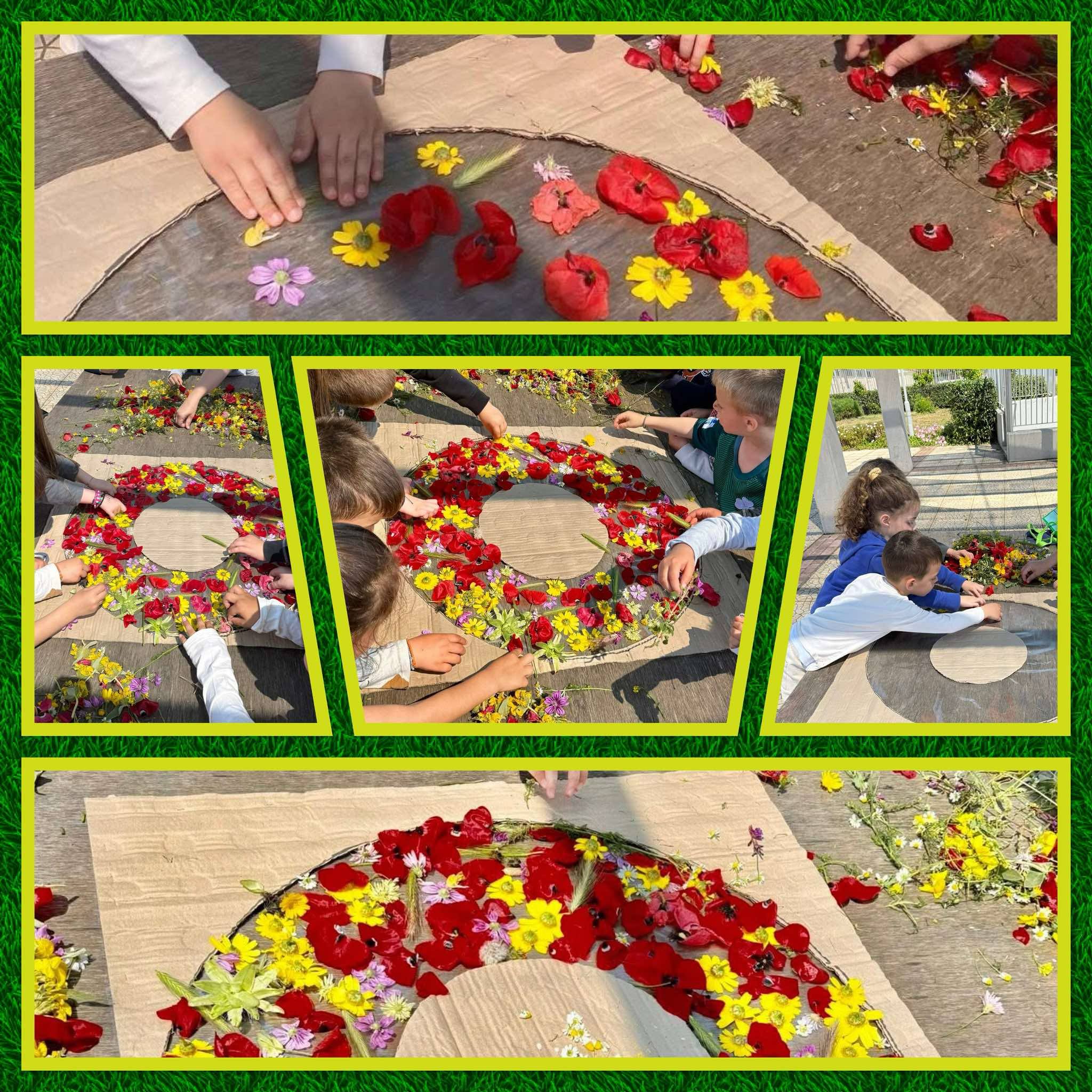 Τα λουλούδια που στόλισαν το έργο μας δεν ήταν τυχαία – τα παιδιά τα μάζεψαν με ενθουσιασμό κατά τη διάρκεια μιας βόλτας μας στην εξοχή. Η φύση τούς χάρισε τα πιο όμορφα υλικά, κι εκείνα τα μετέτρεψαν σε ένα ξεχωριστό Πρωτομαγιάτικο στεφάνι, γεμάτο χρώματα, αρώματα και συμβολισμούς.
