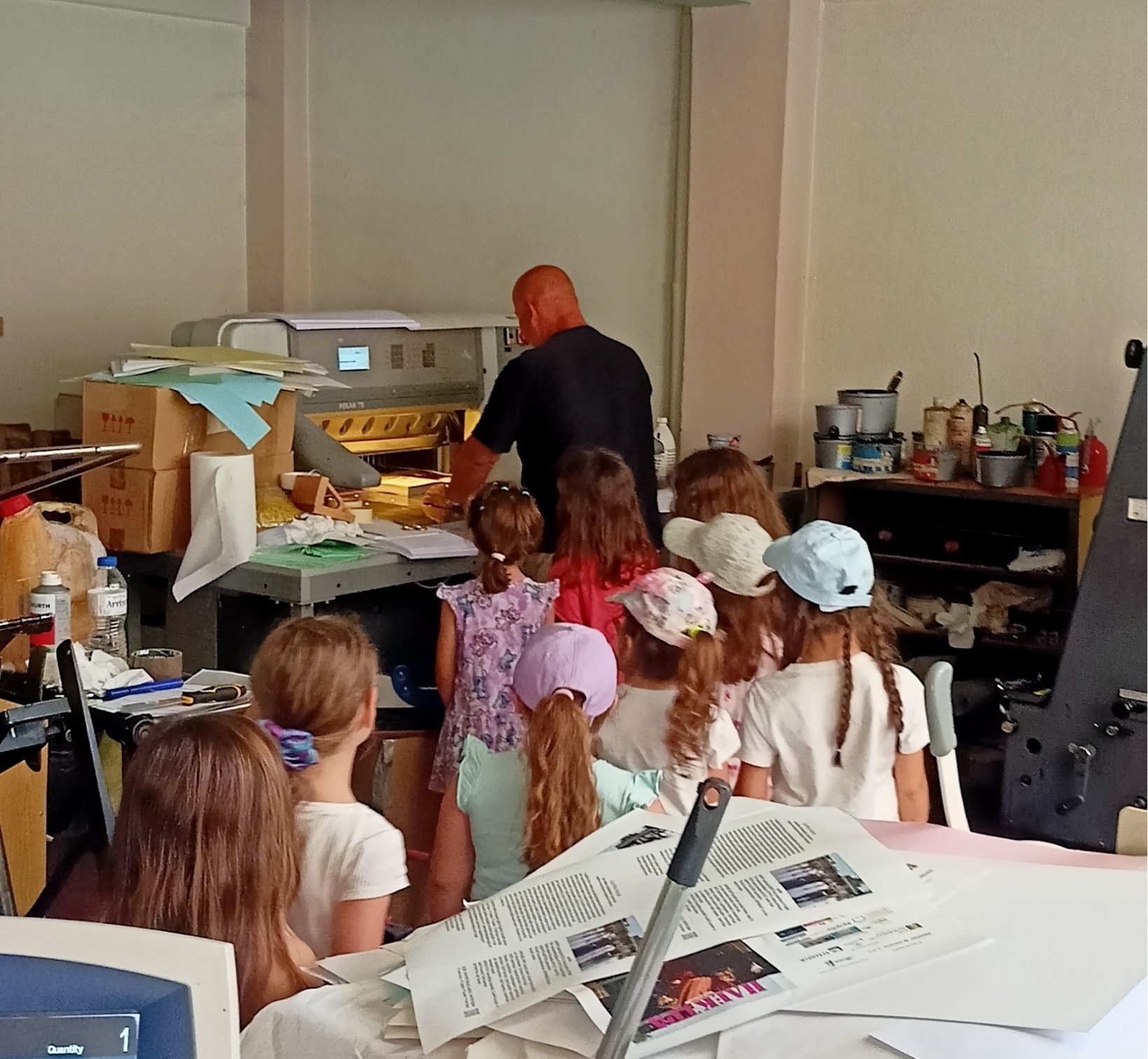 Στα πλαίσια του προγράμματος φιλαναγνωσίας που υλοποιήσαμε στο νηπιαγωγείο μας, είχαμε την ευκαιρία να επισκεφθούμε ένα τοπικό τυπογραφείο και να γνωρίσουμε από κοντά ένα σημαντικό κομμάτι της διαδικασίας παραγωγής έντυπου υλικού. Με τη βοήθεια του υπεύθυνου του τυπογραφείου, τα νήπια παρατήρησαν τα μηχανήματα που χρησιμοποιούνται για την εκτύπωση.