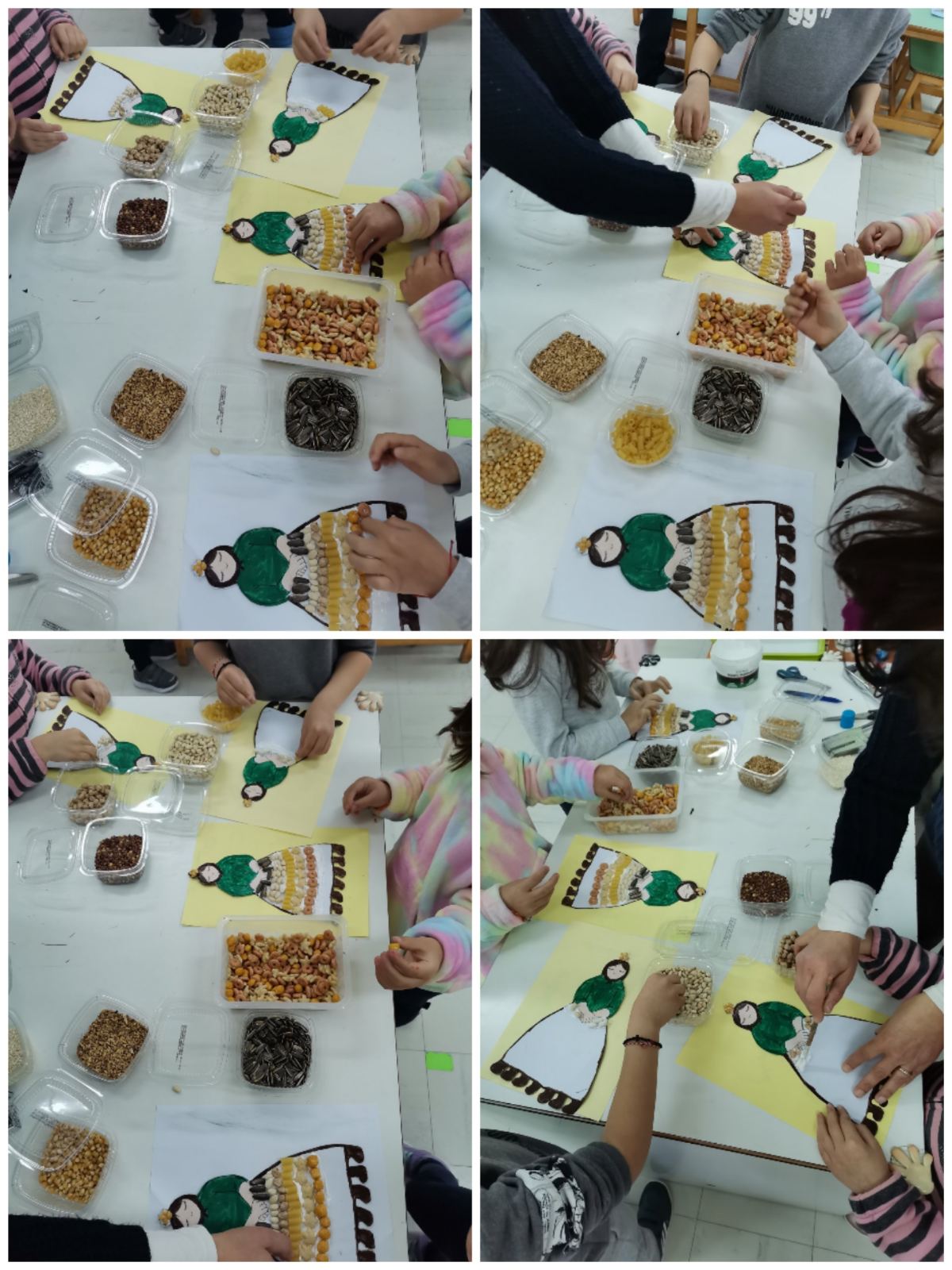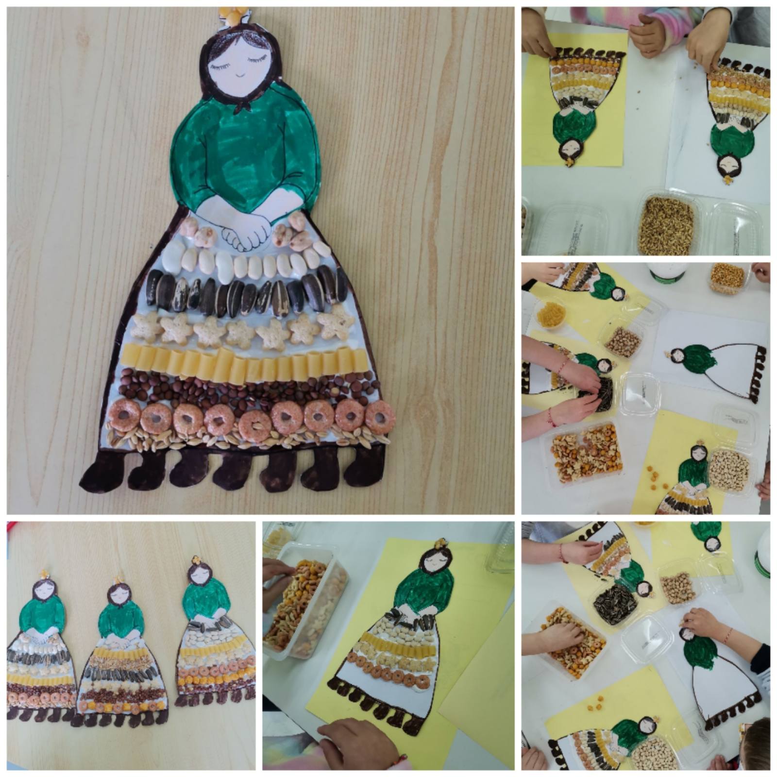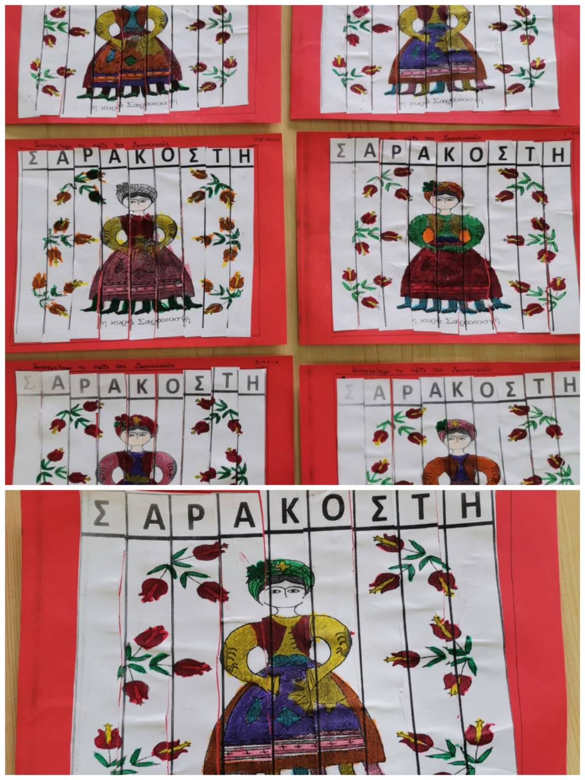 Αφού έγινε η σχετική συζήτηση για την έναρξη της Σαρακοστής και τη σημασία της, βλέποντας σχετικά βίντεο, τα παιδιά κατασκεύασαν την ποδιά της κυρα Σαρακοστής από διάφορα δημητριακά και σπόρους δημιουργώντας το δικό τους μοτίβο. ‘Επειτα συνθέτουν το παζλ βάζοντας σε σειρα τα κομματια με σκοπό να φτιάξουν τη λέξη ΣΑΡΑΚΟΣΤΗ. Τέλος κάνουν το δικό τους χαρταετό, γνωρίζοντας το σχήμα “πολύγωνο” και τη συνθεσή του από πολλά τριγωνα.