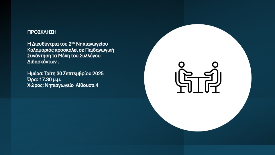 Σας προσκαλούμε στην 2η παιδαγωγική συνάντηση με τις εκπαιδευτικούς του 1ου, 2ου, 3ου & 4ου τμήματος , την Τετάρτη 8 Οκτωβρίου 2025, από τις 6.00 μ.μ. έως τις 8.00 μ.μ., στις αίθουσες των αντίστοιχων της φοίτησης των μαθητών/τριών, τμημάτων.