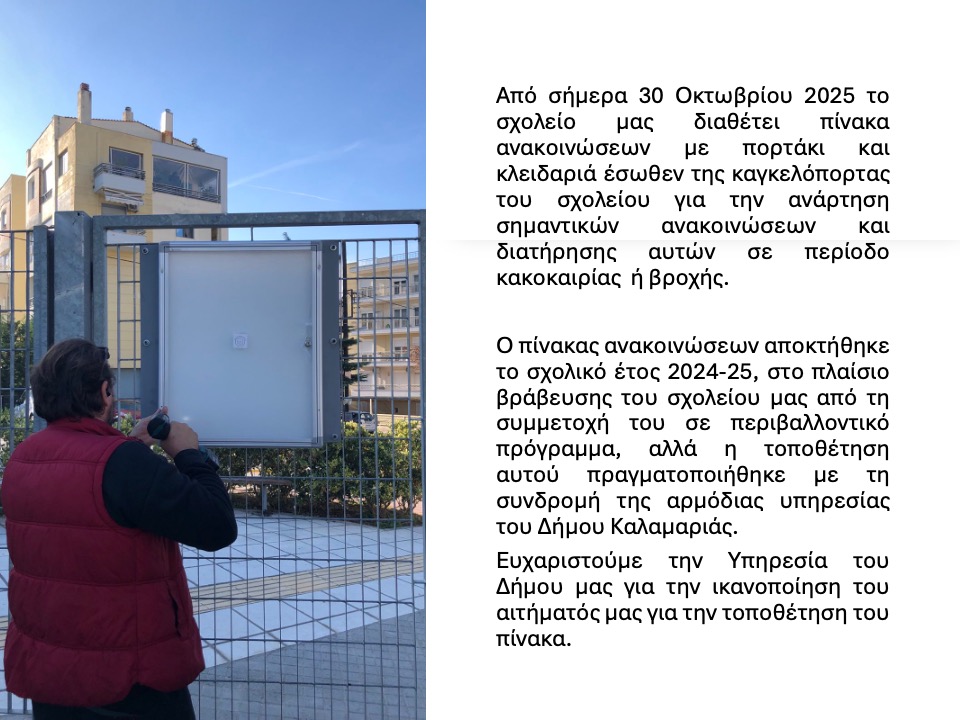 Σας ενημερώνουμε ότι τοποθετήθηκε εξωτερικός πίνακας ανακοινώσεων προς διευκόλυνση της επικοινωνίας σχολείου – οικογένειας. Ο πίνακας φέρει πορτάκι και κλειδαριά, ώστε να διατηρούνται οι ανακοινώσεις ανέπαφες από καιρικά φαινόμενα βροχής, αέρα ή έντονης ηλιοφάνειας. Ευχαριστούμε την Υπηρεσία του Δήμου μας για την τεχνική υποστήριξη, ώστε να τοποθετηθεί με ασφάλεια, ο εξωτερικός πίνακας ανακοινώσεων στην καγκελόπορτα της αυλής.