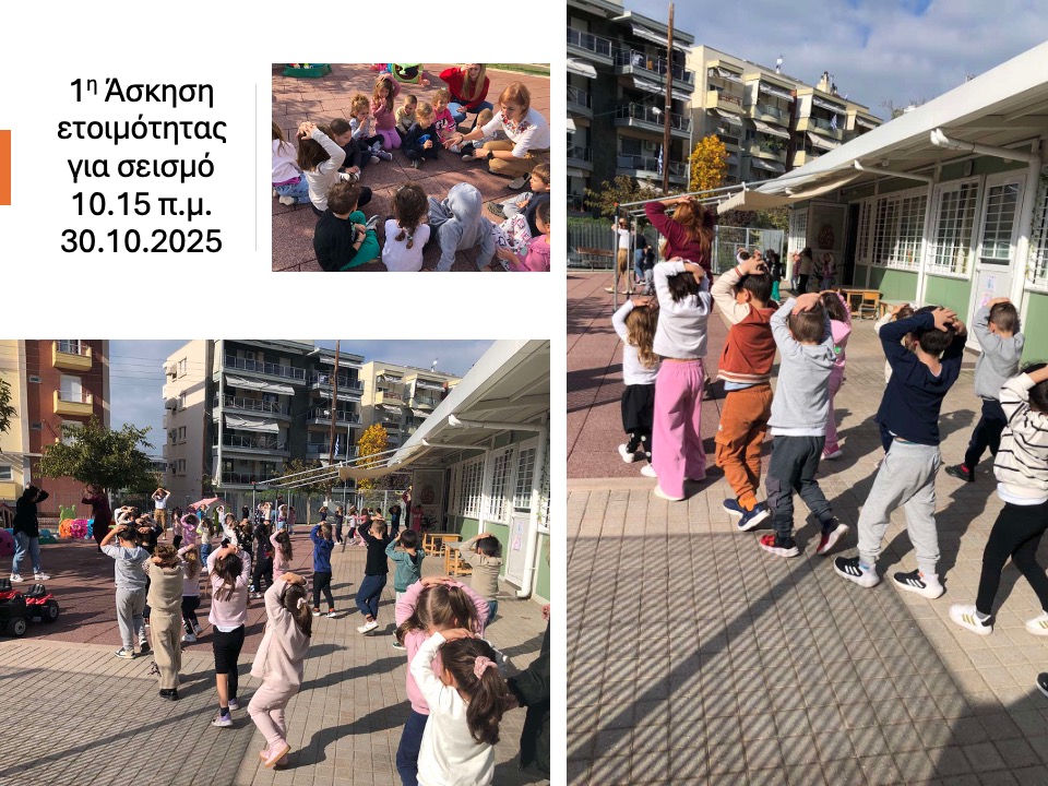 Σήμερα, πραγματοποιήθηκε η 1η άσκηση ετοιμότητας για Σεισμό, σύμφωνα με το Μνημόνιο Ενεργειών Διαχείρισης Σεισμικού Φαινομένου του Σχολείου μας . Με υψηλό βαθμό ανταπόκρισης και χρήση σφυρίχτρας, οι μικροί μαθητές/τριες ακολούθησαν τις οδηγίες των εκπαιδευτικών τους και ολοκλήρωσαν επιτυχώς την άσκηση ετοιμότητας σε τρία διαδοχικά βήματα.