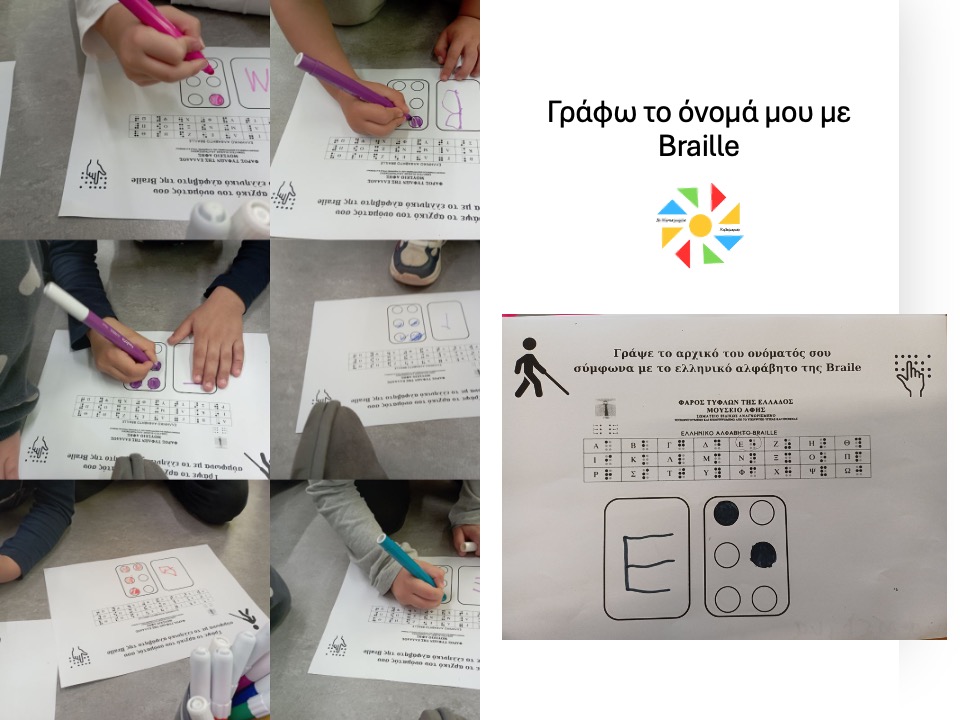 Με δραστηριότητες προσανατολισμένες στη διαφορετικότητα όπως τεχνικές συνοδείας λευκού μπαστουνιού, παζλς συμπερίληψης, απτικά επιτραπέζια παιχνίδια και κούκλα βοηθός για την εκμάθηση γραφής Braille, μέλη του Συλλόγου Ενόρασης και παράλληλα μέλος από τον Σύλλογο Γονέων και Κηδεμόνων του σχολείου μας, ξενάγησε τους μικρούς μαθητές/τριες στο πεζοδρόμιο έξωθεν του Σχολείου, προκειμένου να γνωρίσουν τους λόγους που ορισμένα πλακάκια του πεζοδρομίου έχουν κίτρινο χρώμα με ανάγλυφες γραμμές και σφαιρίδια.