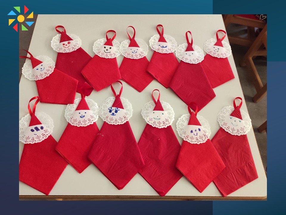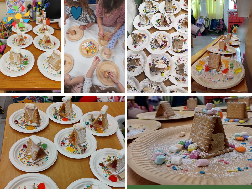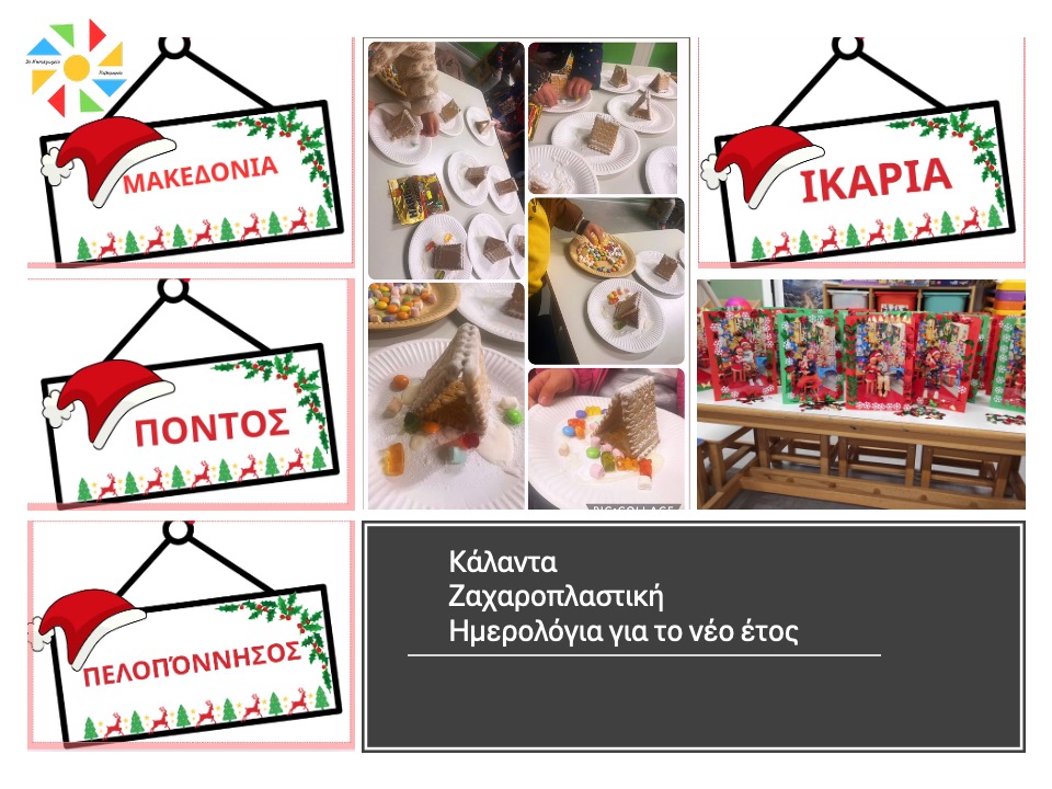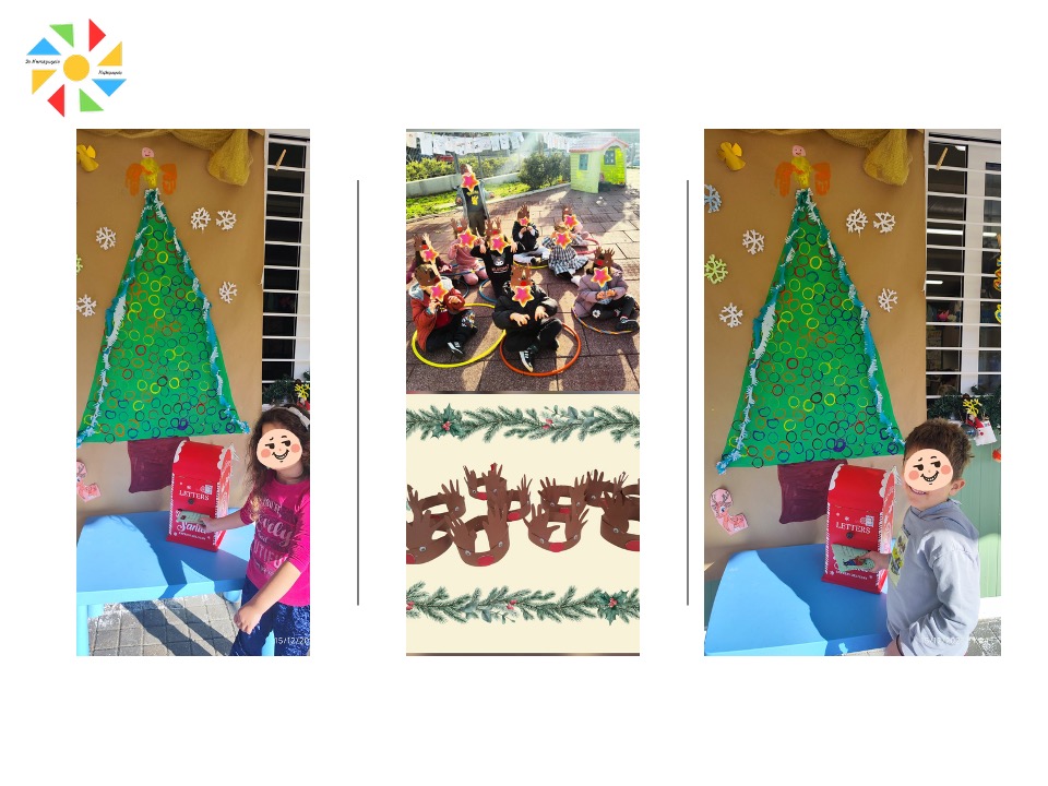 Εικαστικές δραστηριότητες όπως πιτζάμα πάρτι, θεατρικό δρώμενο με αφόρμηση τη παιδική λογοτεχνία, χριστουγεννιάτικο δεντράκι με οικολογικά στολίδια, χριστουγεννιάτικες μπισκοτολιχουδιές, οικολογικές δημιουργίες με θέμα τον Άγιο Βασίλη και σκουφάκι με ευχές, η φάτνη των Χριστουγέννων, γράμμα στον Άγιο Βασίλη, συνθέτουν ένα πολύχρωμο μωσαϊκό βιωματικών δραστηριοτήτων και χαρούμενων στιγμών για τους μικρούς μαθητές/τριές μας που απολαμβάνουν και παράλληλα κλιμακώνουν την προσμονή τους για τη Χριστουγεννιάτικη γιορτή!