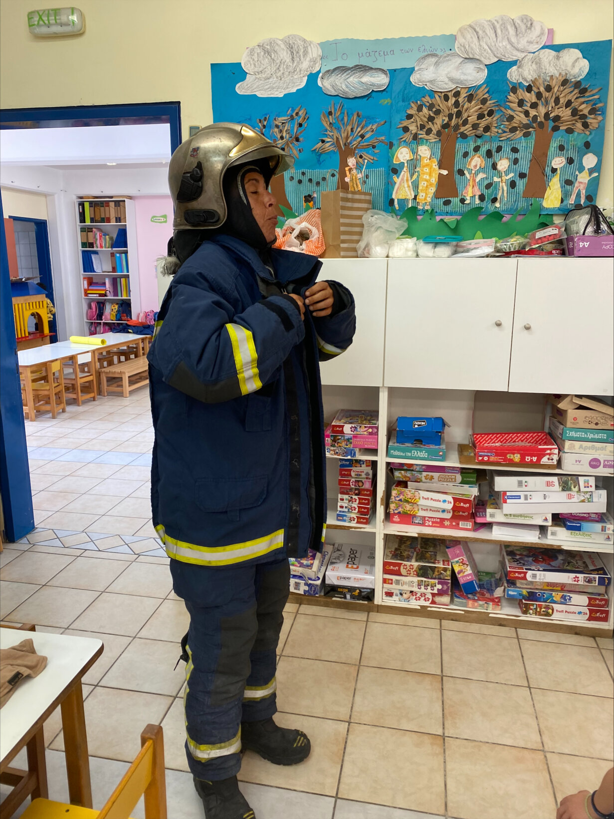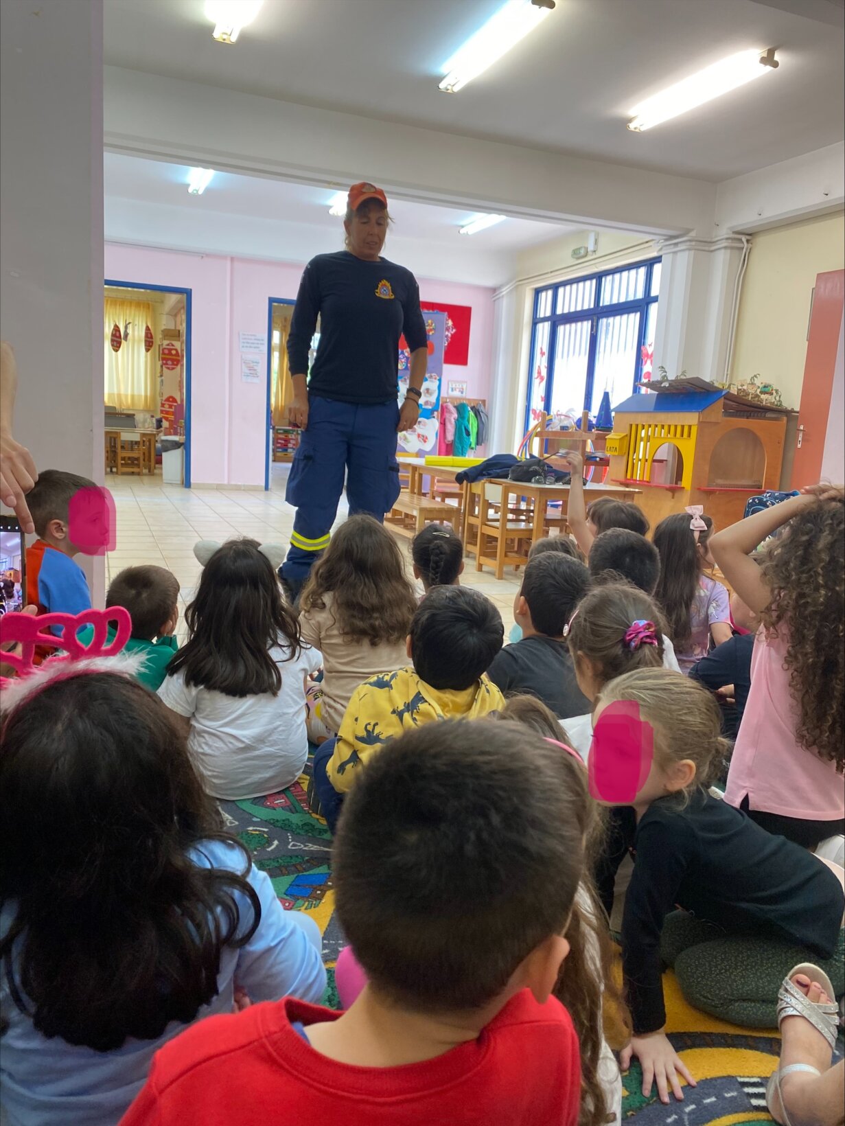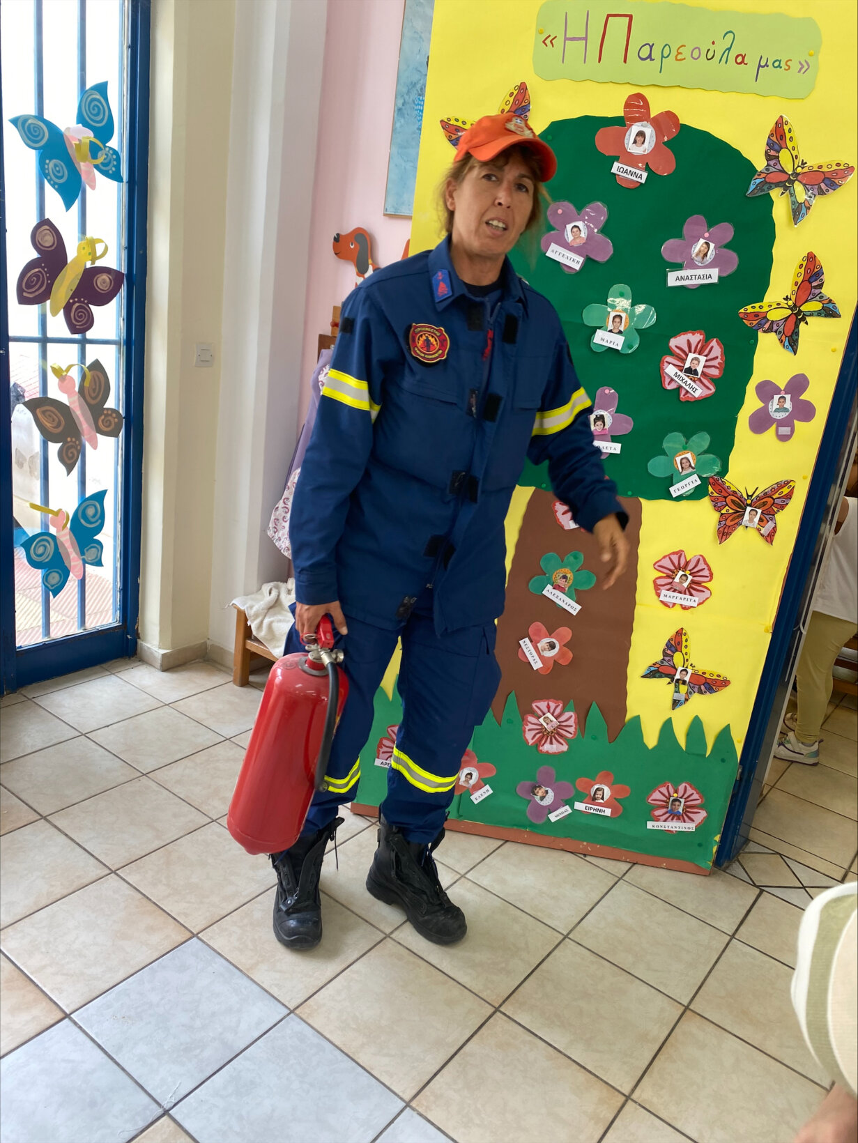 Επίσκεψη στο νηπιαγωγείο μας στις 24 Απριλίου το 2024, της πυροσβεστικής υπηρεσίας του τμήματος Καλλιθέας και συγκεκριμένα της κυρίας Δάφνης, αξιωματικού της πυροσβεστικής υπηρεσίας, η οποία μίλησα στα παιδιά για τους πυροσβέστες, τους δασοπυροσβέστες, τις δυσκολίες που αντιμετωπίζουν, για την στολή τους, την προσφορά τους κα. Στη συνέχεια, απάντησε σε τυχόν απορίες των παιδιών για τους πυροσβέστες.