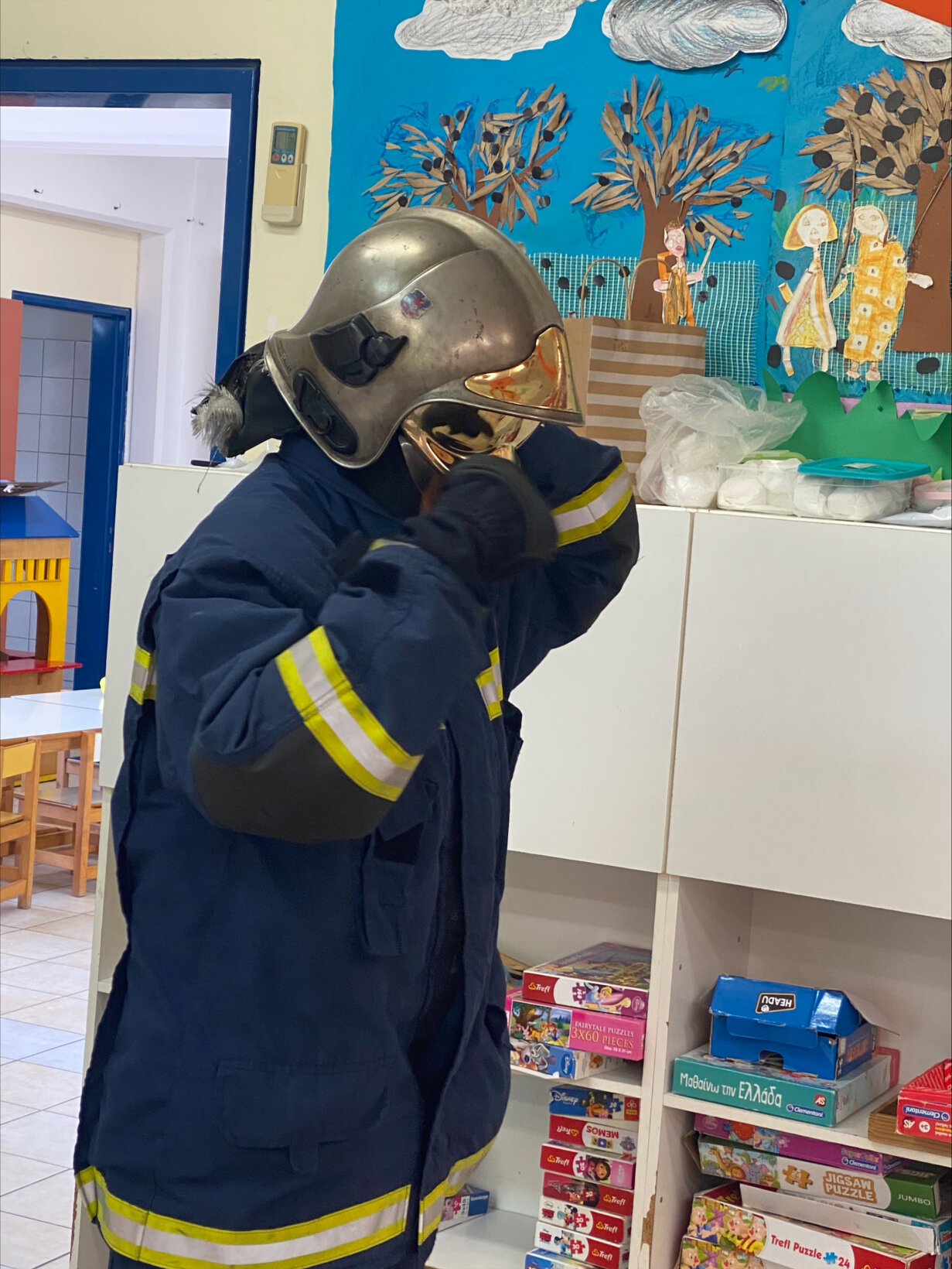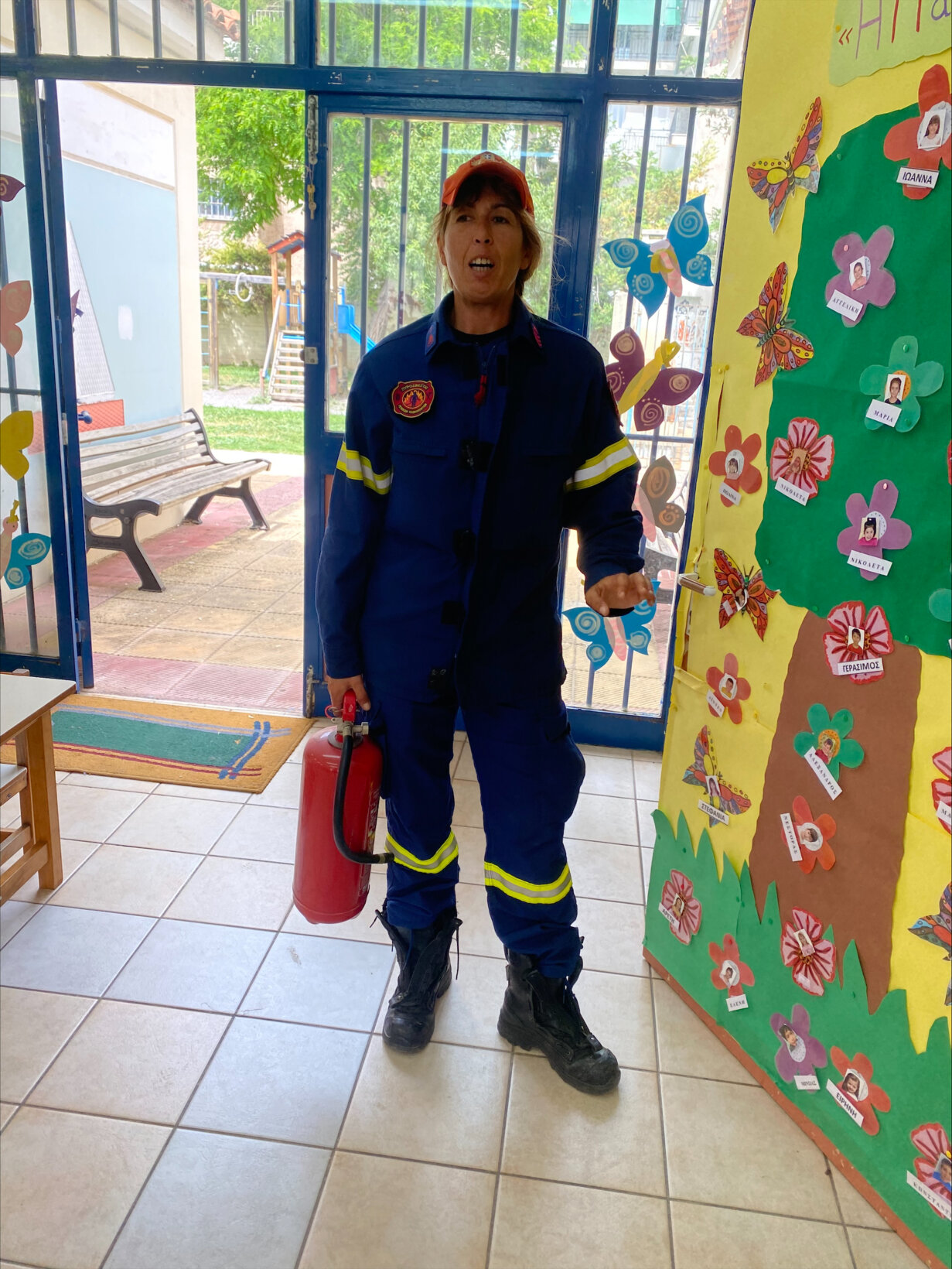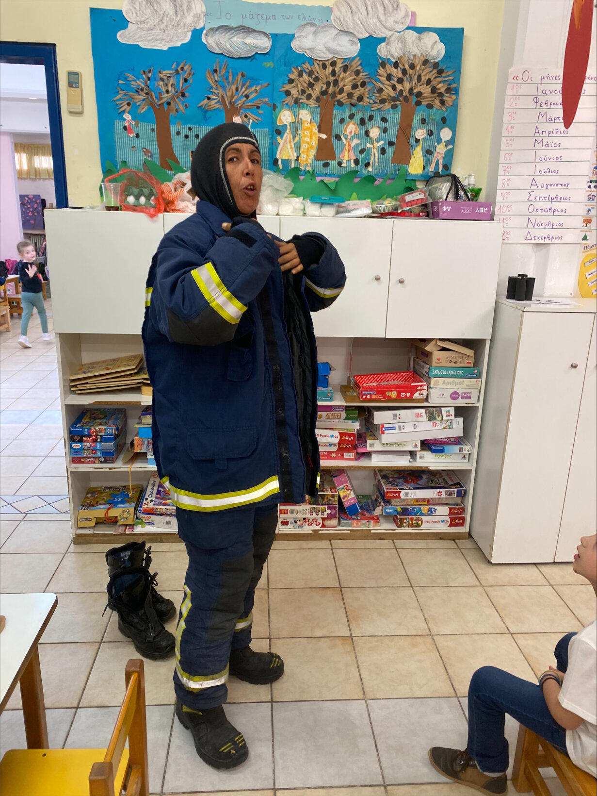 Επίσκεψη στο νηπιαγωγείο μας στις 24 Απριλίου το 2024, της πυροσβεστικής υπηρεσίας του τμήματος Καλλιθέας και συγκεκριμένα της κυρίας Δάφνης, αξιωματικού της πυροσβεστικής υπηρεσίας, η οποία μίλησα στα παιδιά για τους πυροσβέστες, τους δασοπυροσβέστες, τις δυσκολίες που αντιμετωπίζουν, για την στολή τους, την προσφορά τους κα. Στη συνέχεια, απάντησε σε τυχόν απορίες των παιδιών για τους πυροσβέστες.