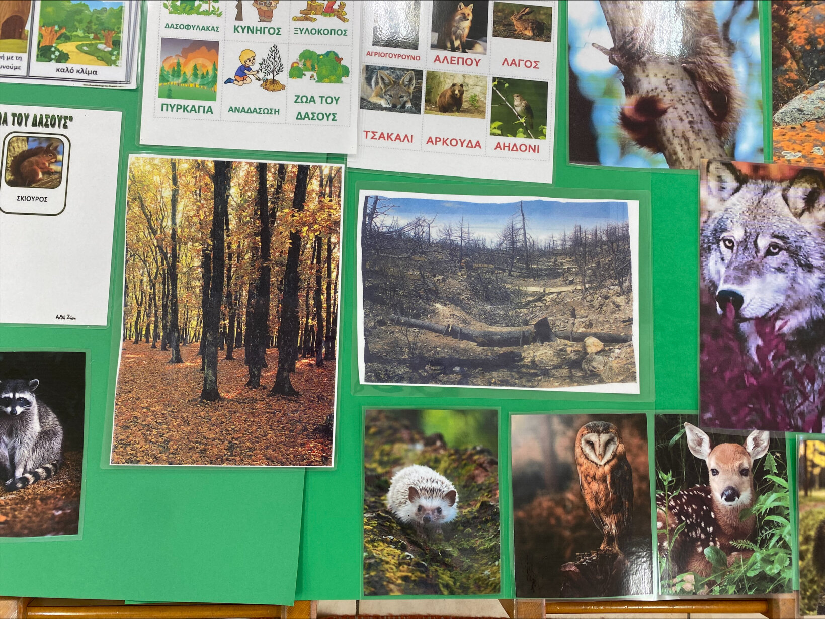 ”Το δάσος κινδυνεύει”. Άσκηση σειραθέτησης και κολάζ. Τα παιδιά επισημαίνουν τους κινδύνους του δάσους (πυρκαγιές, σκουπίδια κα) -καταγραφή απόψεων των παιδιών.