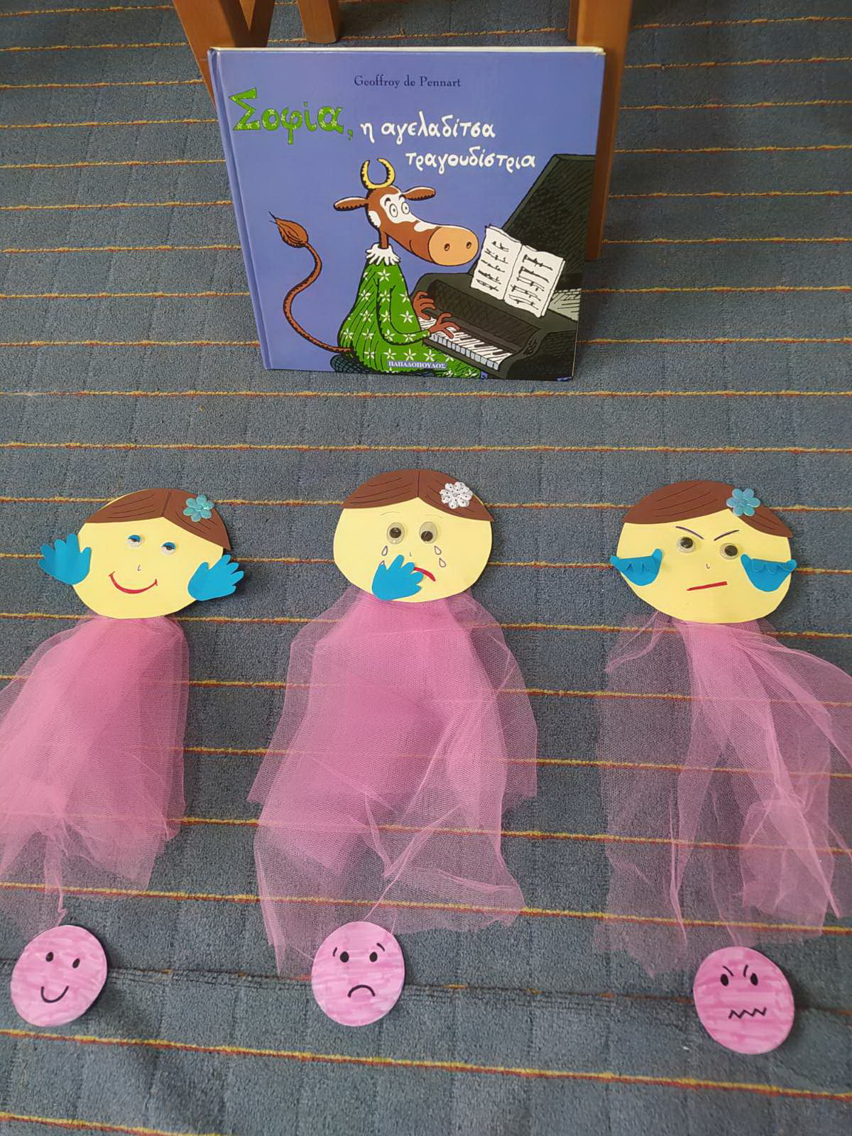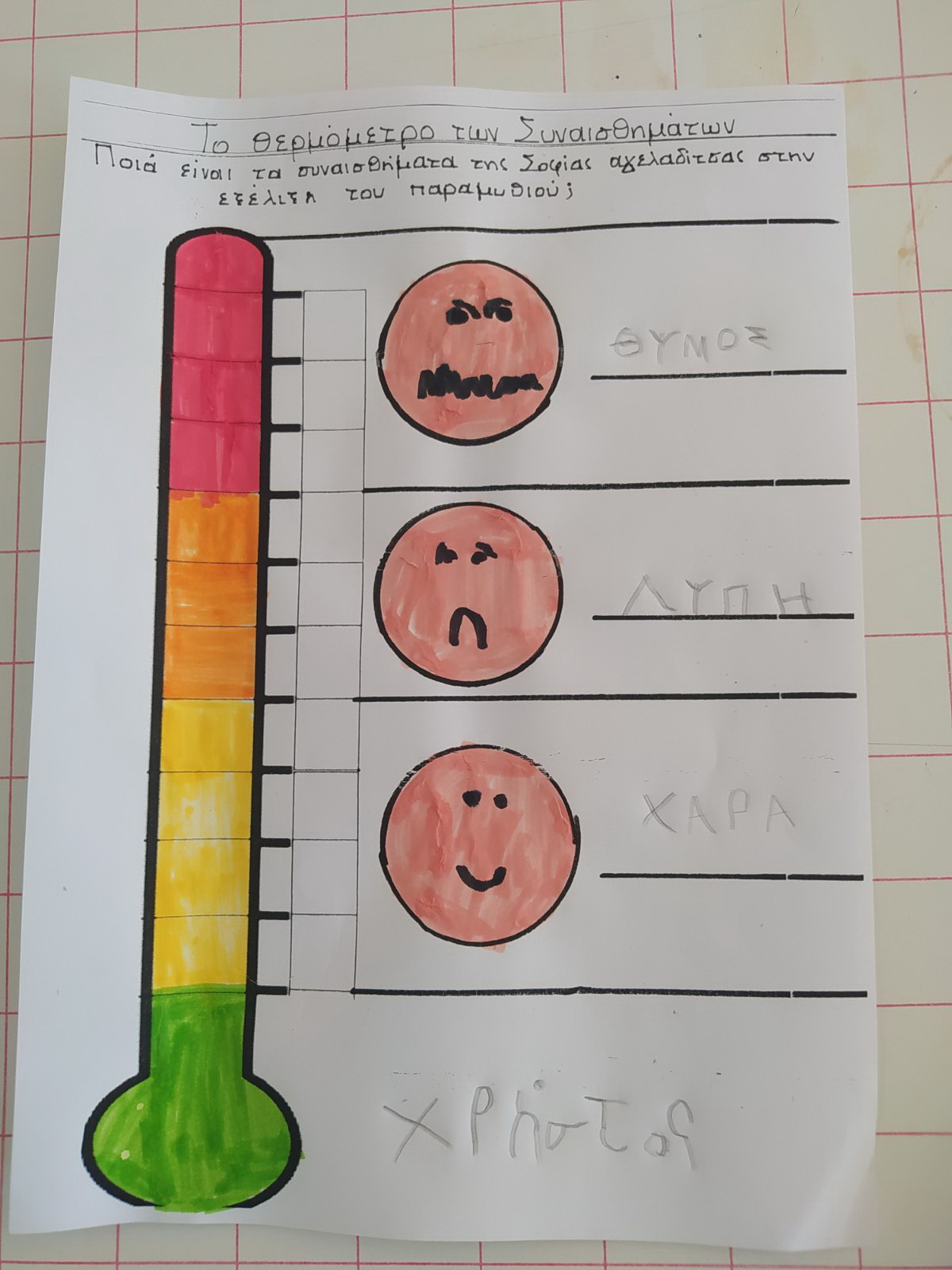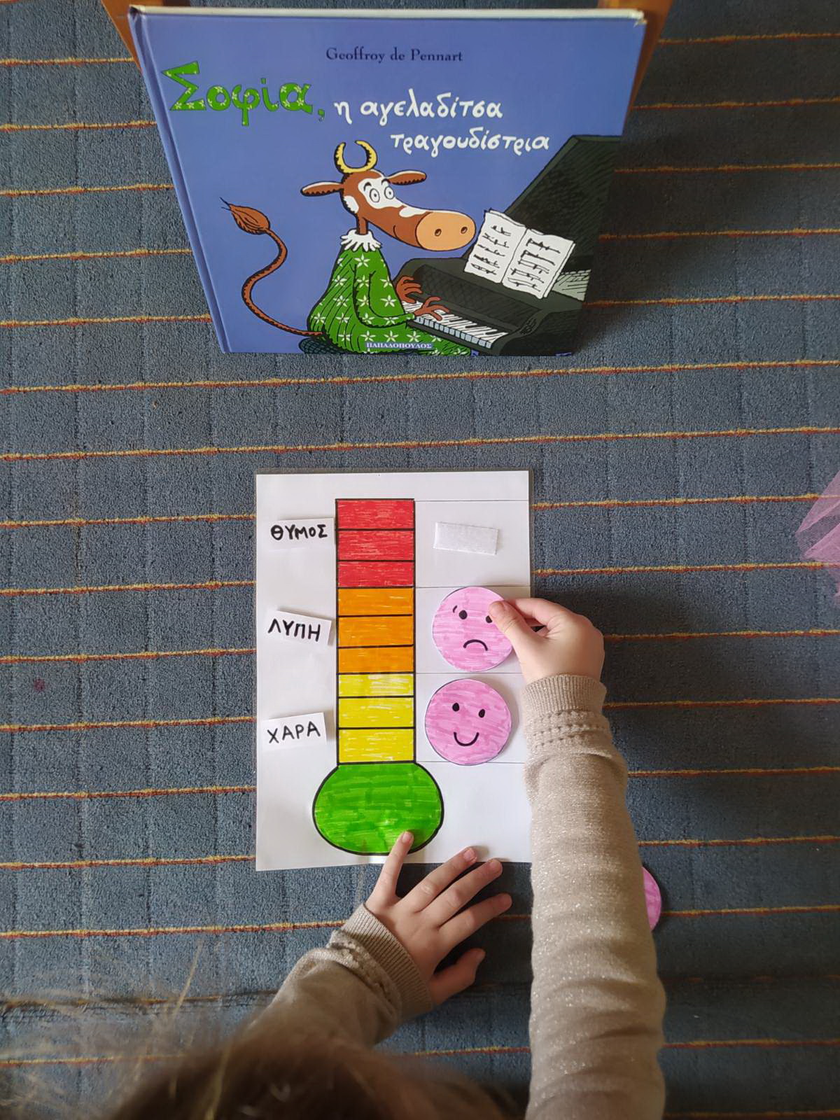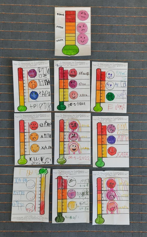 Σε συνέχεια της επεξεργασίας του βιβλίου “Σοφία η αγελαδίτσα τραγουδίστρια” εμβαθύναμε στα συναισθήματα που μπορεί να νιώθει κάποιος/κάποια όταν γίνονται διακρίσεις εις βάρος του. Με στόχο την καλλιέργεια της ενσυναίσθησης και της κατανόησης -αποδοχής του “άλλου” συζητήσαμε για τα συναισθήματα που μπορεί να ένιωσε η Σοφία η αγελαδίτσα. Μπήκαμε στη θέση της και εκφράσαμε τα συναισθήματα με το σώμα μας και τις εκφράσεις του προσώπου μας. Τέλος, φτιάξαμε “το θερμόμετρο των συναισθημάτων”