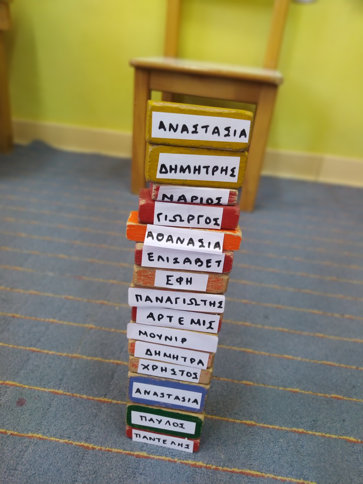 Ο καθένας είναι μοναδικός και σημαντικό μέλος της ομάδας. Δραστηριότητα “ο πύργος των ονομάτων”. Τα παιδιά χτίζουν έναν πύργο από τουβλάκια που το καθένα γράφει το όνομά τους. Ύστερα καλούνται να να αφαιρέσουν ένα τουβλάκι χωρίς να γκρεμιστεί ο πύργος.
