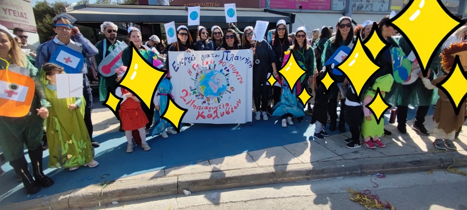 Έτσι ξεκίνησε και ολοκληρώθηκε η παρέλαση του 2ου Νηπιαγωγείου Καλυβίων στο Καρναβάλι με αρωγούς και συμμάχους τους γονείς και τους εκπαιδευτικούς.Το θέμα μας” Ενεργώ Για τον Πλανήτη:Η Γη μας έχει 40 πυρετο “,αποτέλεσε έμπνευση,πηγή προβληματισμών και επιμέρους κατασκευων,αφορμή να μεταμορφωθούμε σε πλάσματα της Γης,του Νερού και του Αέρα και να φωνάξουμε με τραγούδια και παιδικές φωνες για ένα καλύτερο μέλλον για τον Πλανήτη μας.
