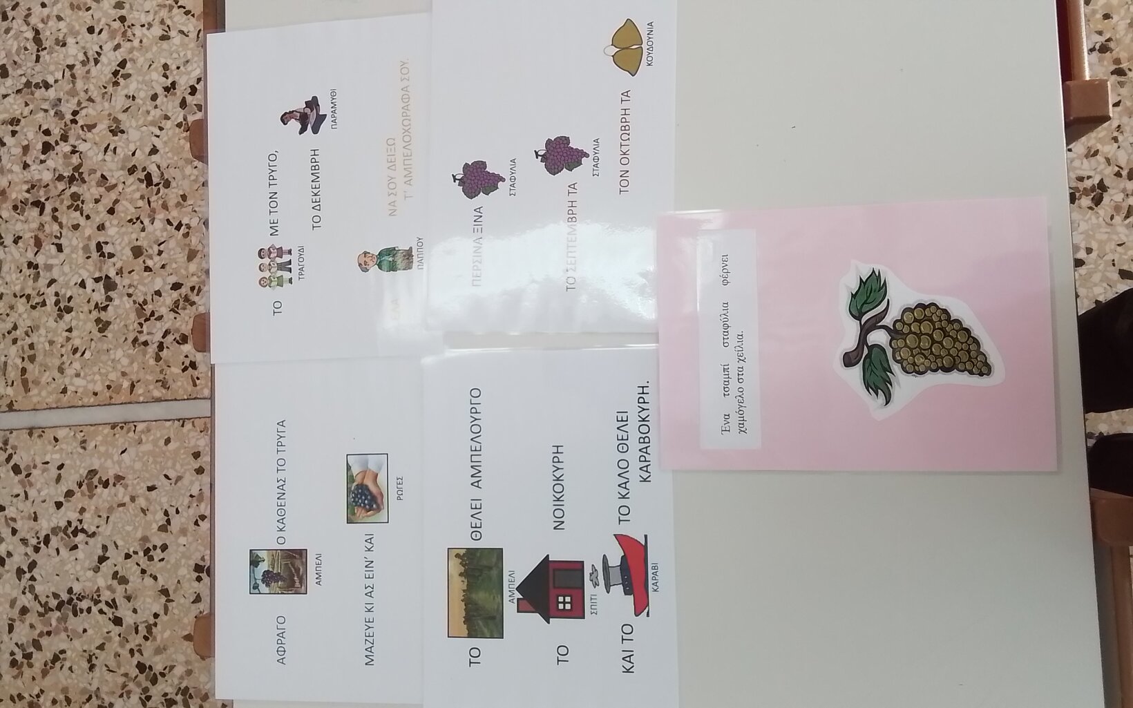 | Σέ μια ρώγα από σταφύλι έπεσαν οχτώ σπουργίτες και τρωγόπιναν οι φίλοι. Τσίρι – τίρι, τσιριτρό, τσιριτρί, τσιριτρό!Έχτυπούσανε τις μύτες και κουνούσαν τις ουρές κι είχαν γέλια και χαρές. Τσίρι -τίρι, τσιριτρό, τσιριτρί, τσιριτρό!Πώ πω πώ πω σε μια ρώγα φαγοπότι και φωνή! την αφήκαν αδειανή. Τσίρι -τίρι, τσιριτρό, τσιριτρί, τσιριτρό! Και μέθυσαν κι ολημέρα Ζαχαρίας Παπαντωνίου