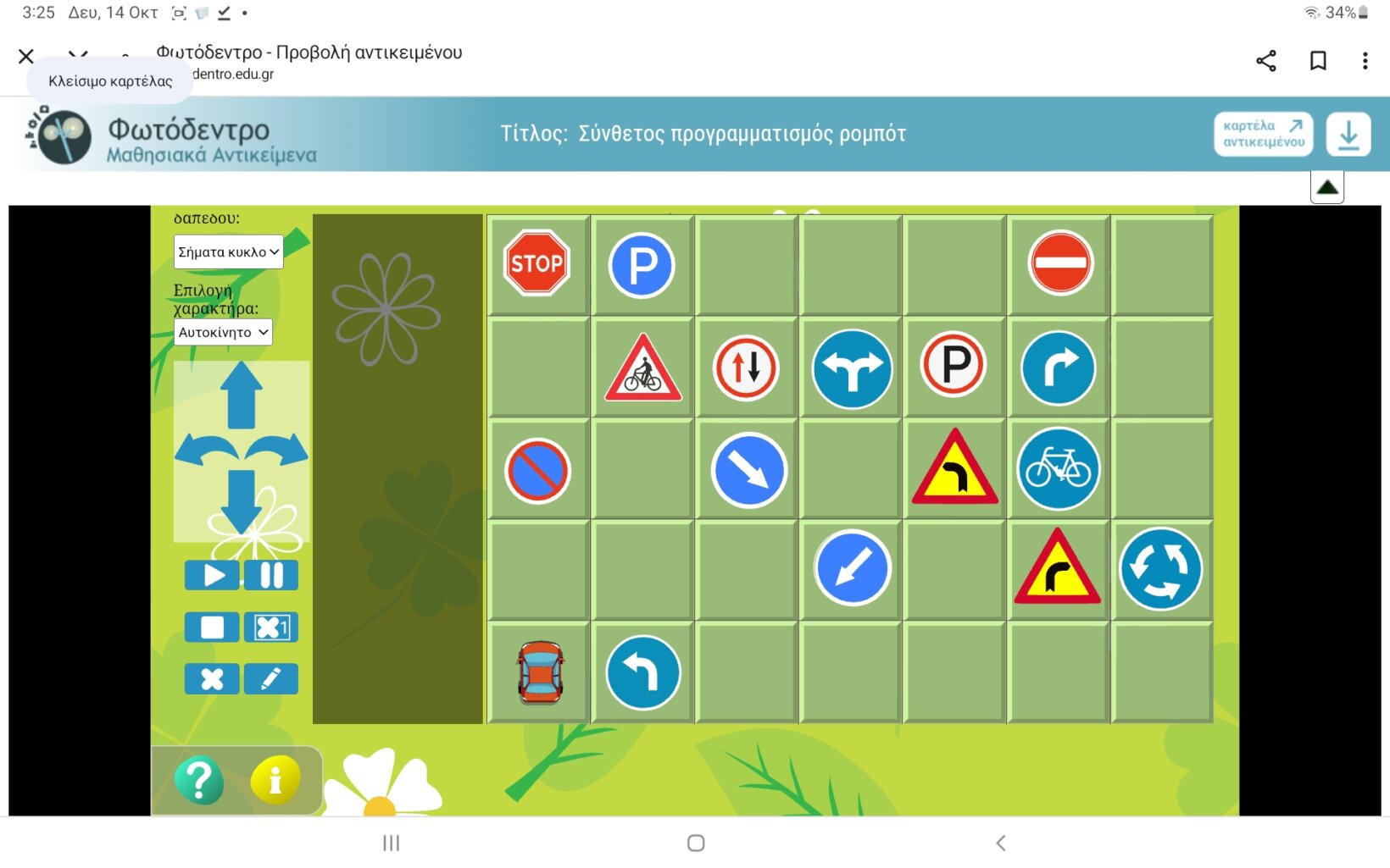 - Προγραμματισμός του αυτοκινήτου – ρομπότ, για ασφαλή κίνηση σε καθορισμένο δρομολόγιο ακολουθώντας τα σήματα κυκλοφορίας (Εργασία από Photodentro) κλπ