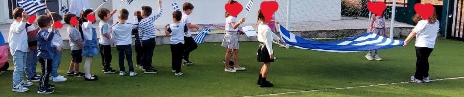 Την ημέρα της σχολικής μας γιορτής για την εθνική επέτειο του ΟΧΙ, συζητήσαμε για τον πόλεμο του 1940, αναλύσαμε την επιλογή των χρωμάτων της ελληνικής σημαίας, ακούσαμε και τραγουδήσαμε « Τα ραφτικά της γιαγιάς» και το τραγούδι «Κορόιδο Μουσολίνι» και στη συνέχεια είδαμε ένα μικρό απόσπασμα από την ιστορική ταινία « Το ξυπόλητο τάγμα» του Γκρεγκ Τάλας. Έπειτα, βγήκαμε στον προαύλιο χώρο και δραματοποιήσαμε την αληθινή ιστορία της ηρωικής συμμορίας των ορφανών της Θεσσαλονίκης «Ξυπόλητο Τάγμα» που έκλεβε τρόφιμα και φάρμακα από τους κατακτητές κατά τη διάρκεια της Κατοχής. Ολοκληρώνοντας, κάναμε τη δική μας παρέλαση στον προαύλιο χώρο του σχολείου μας και τραγουδήσαμε τον Εθνικό μας Ύμνο!