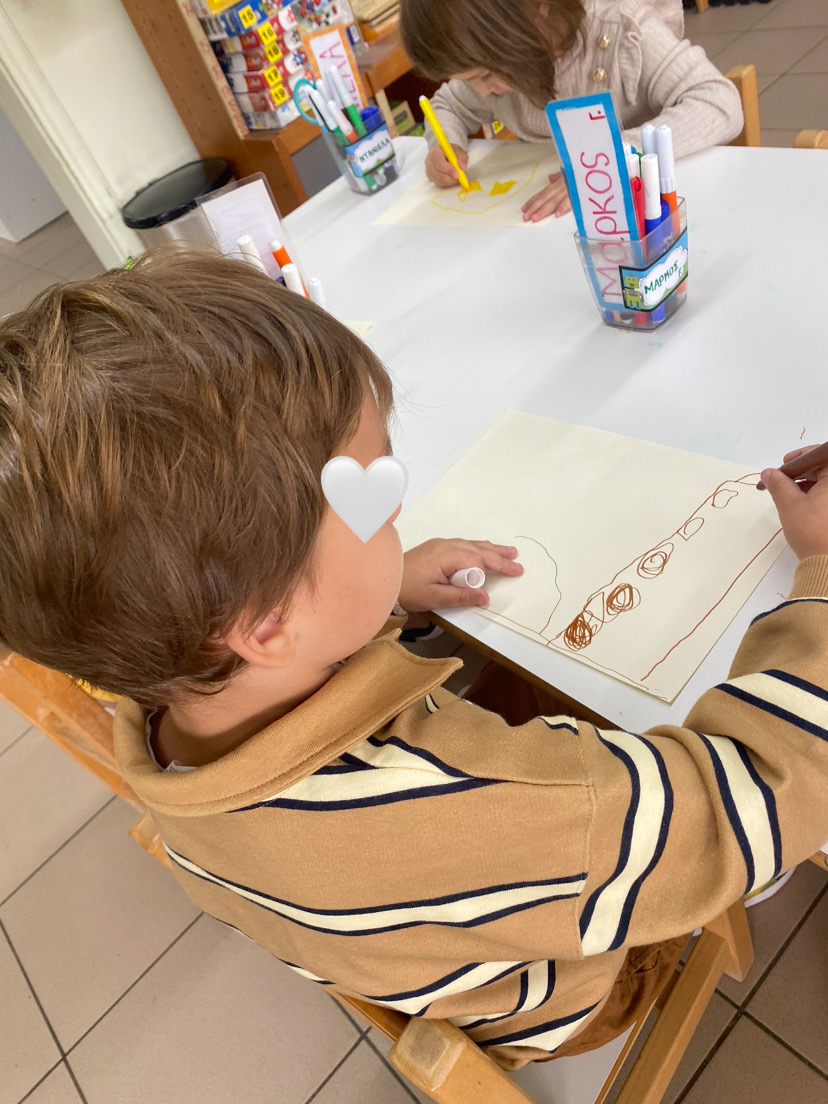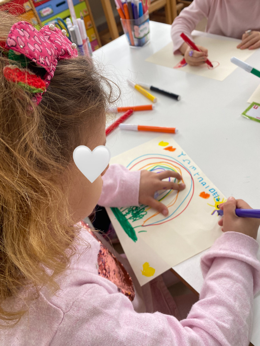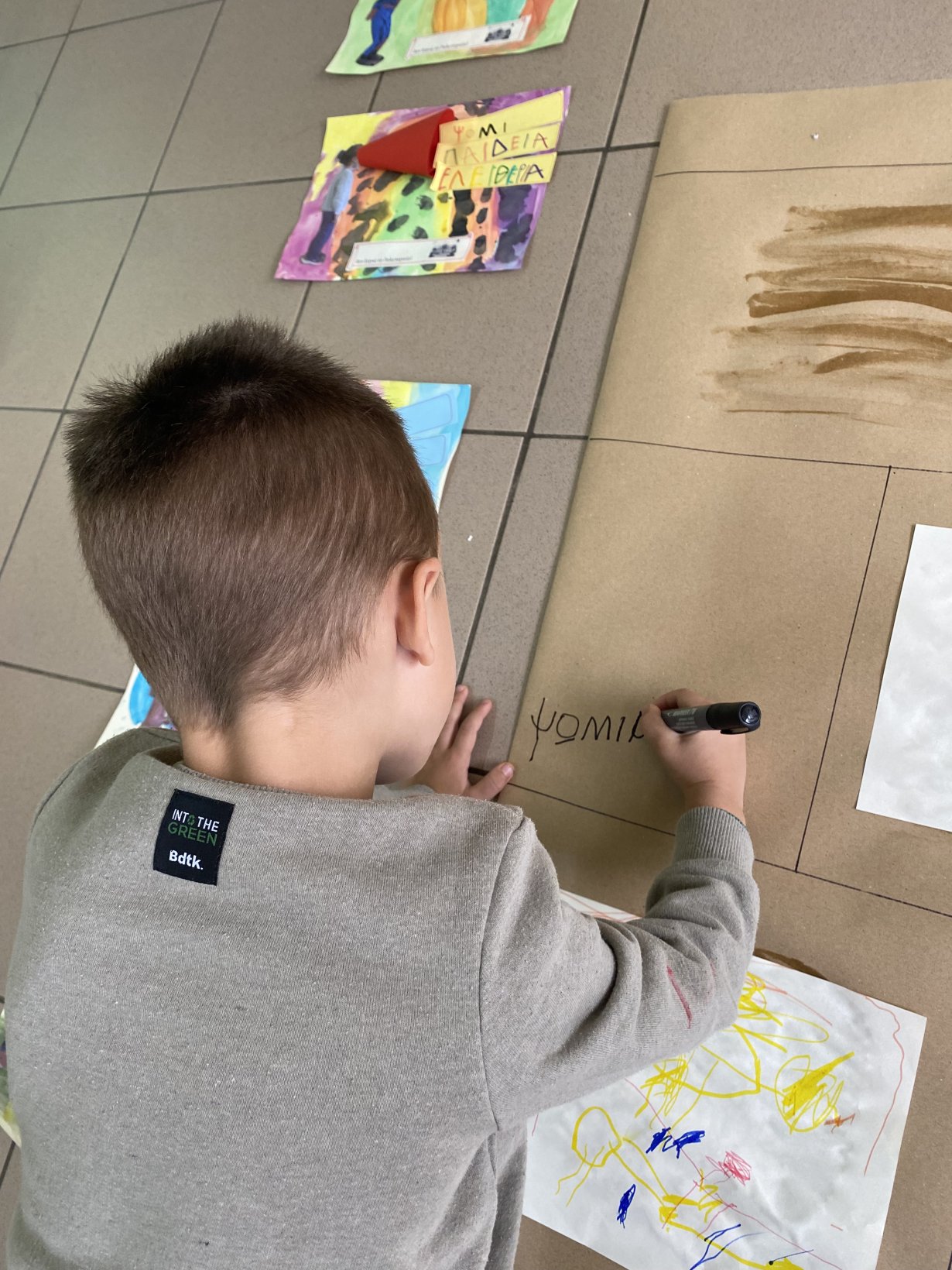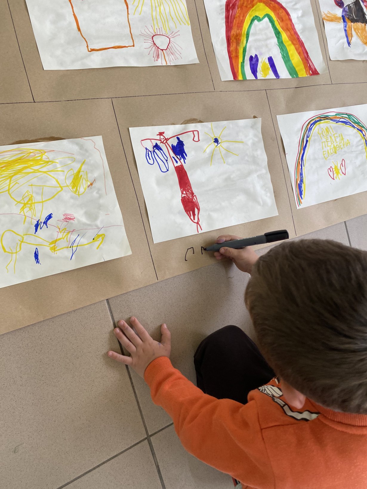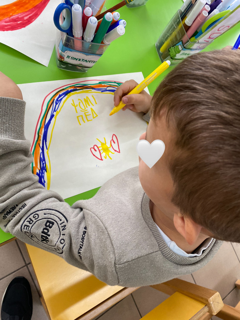 Τέλος, εμπνευστήκαμε από την ακρόαση του τραγουδιού «τα παιδιά ζωγραφίζουν στον τοίχο» και αποτυπώσαμε τις ιδέες μας σε χαρτί για να φτιάξουμε τον δικό μας τοίχο γεμάτο από τα χρώματα και την ελπίδα των μικρών παιδιών.