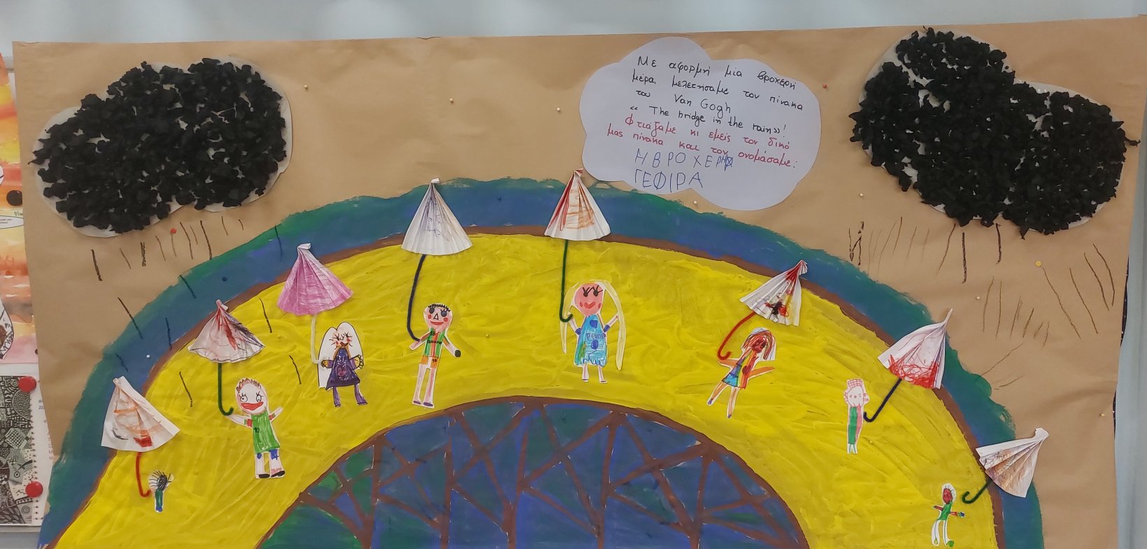 Κι επειδή Νοέμβρης χωρίς βροχές δεν γίνεται, προσπαθήσαμε να κατανοήσουμε το φυσικό φαινόμενο της βροχής. Πειραματιστήκαμε για να εξηγήσουμε τον κύκλο του νερού, παίξαμε με τις σταγόνες και αποτυπώσαμε όσα μάθαμε σε μακέτα και σε πίνακα ζωγραφικής, εμπνευσμένοι από τον πίνακα του Van Gogh “Η γέφυρα στη βροχή”.