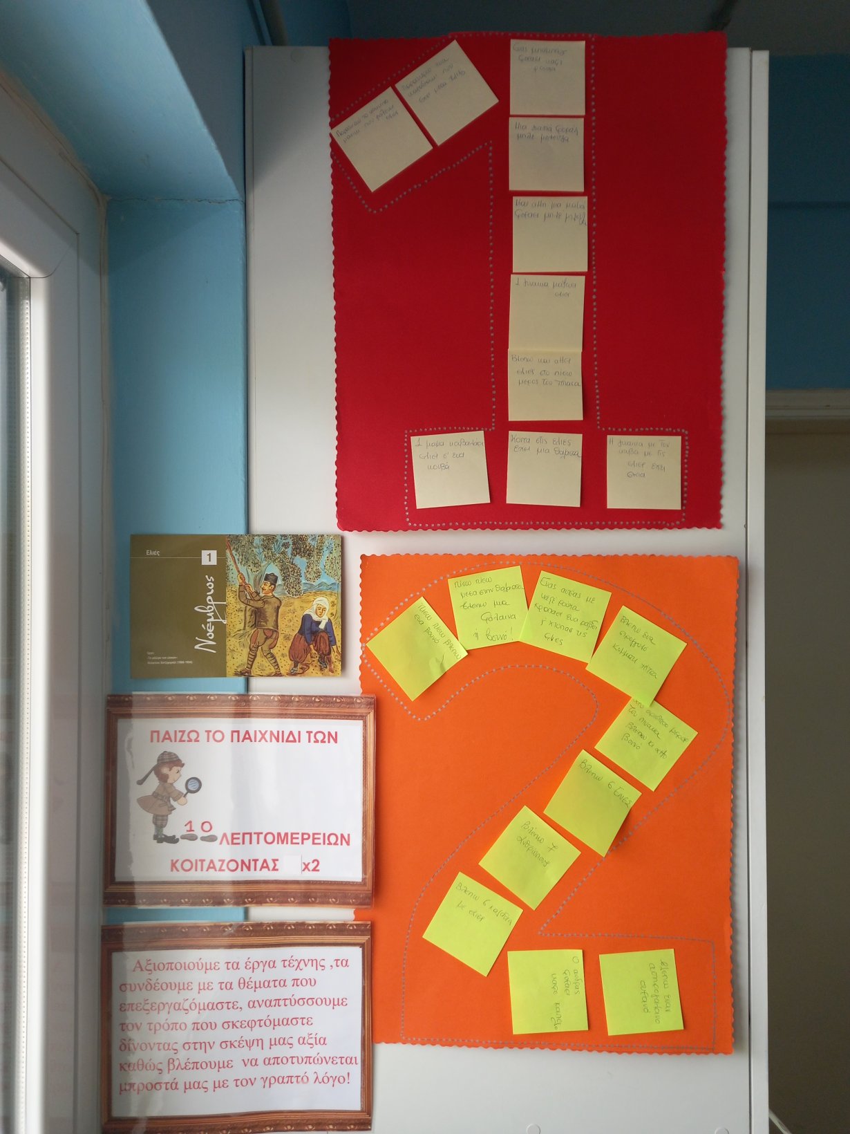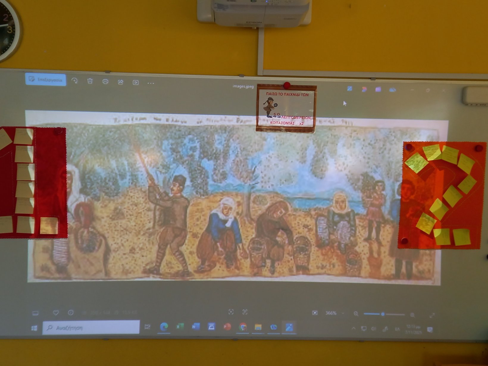 Γνωρίσαμε τις αγροτικές εργασίες του μήνα, συγκεκριμένα το λιομάζωμα, μέσα από τον πίνακα του ζωγράφου Θεόφιλου και εξοικειωθήκαμε με τις ρουτίνες σκέψης, εντοπίζοντας 10 λεπτομέρειες του πίνακα 2 φορές, προτού συνθέσουμε το δικό μας έργο με το μάζεμα της ελιάς.