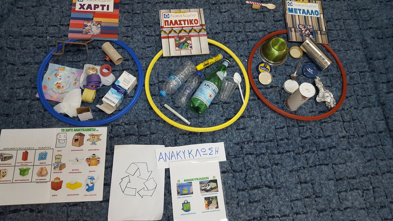 Οι μαθητές/τριες καταγράφουν τα απορρίμματα της τάξης και τους τρόπους διαχείρισής τους. Αναγνωρίζουν τη σήμανση της ανακύκλωσης. Φέρνουν από το σπίτι τους διάφορα ανακυκλώσιμα υλικά. Τα παιδιά παίζουν ένα κινητικό παιχνίδι και διαχωρίζουν τα ανακυκλώσιμα είδη (π.χ. σε στεφάνια με σήμανση).