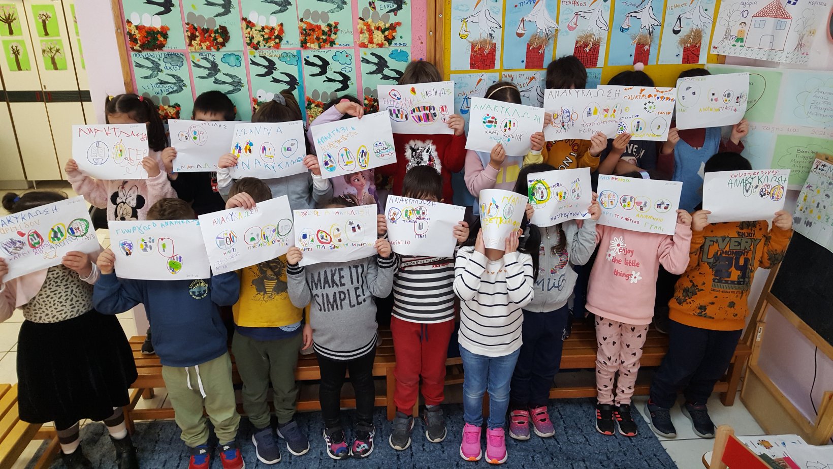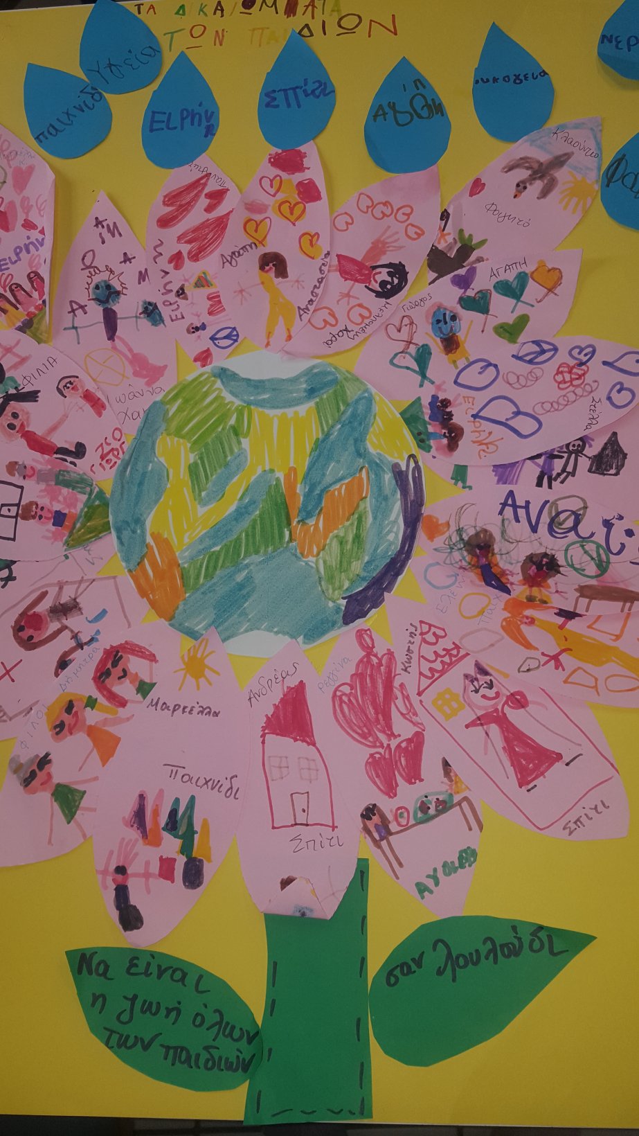 ευχές για όλα τα παιδιά του κόσμου, πχ. χαρά, φαγητό, παιχνίδι, σχολείο ,υγεία, αγάπη, οικογένεια ,. Στην συνέχεια τα κολλάνε στο μεγάλο χαρτόνι ώστε να αποτελέσει τα πέταλα ενός λουλουδιού και τις σταγόνες που το ποτίζουν !