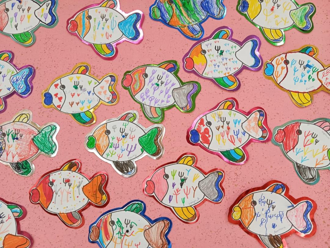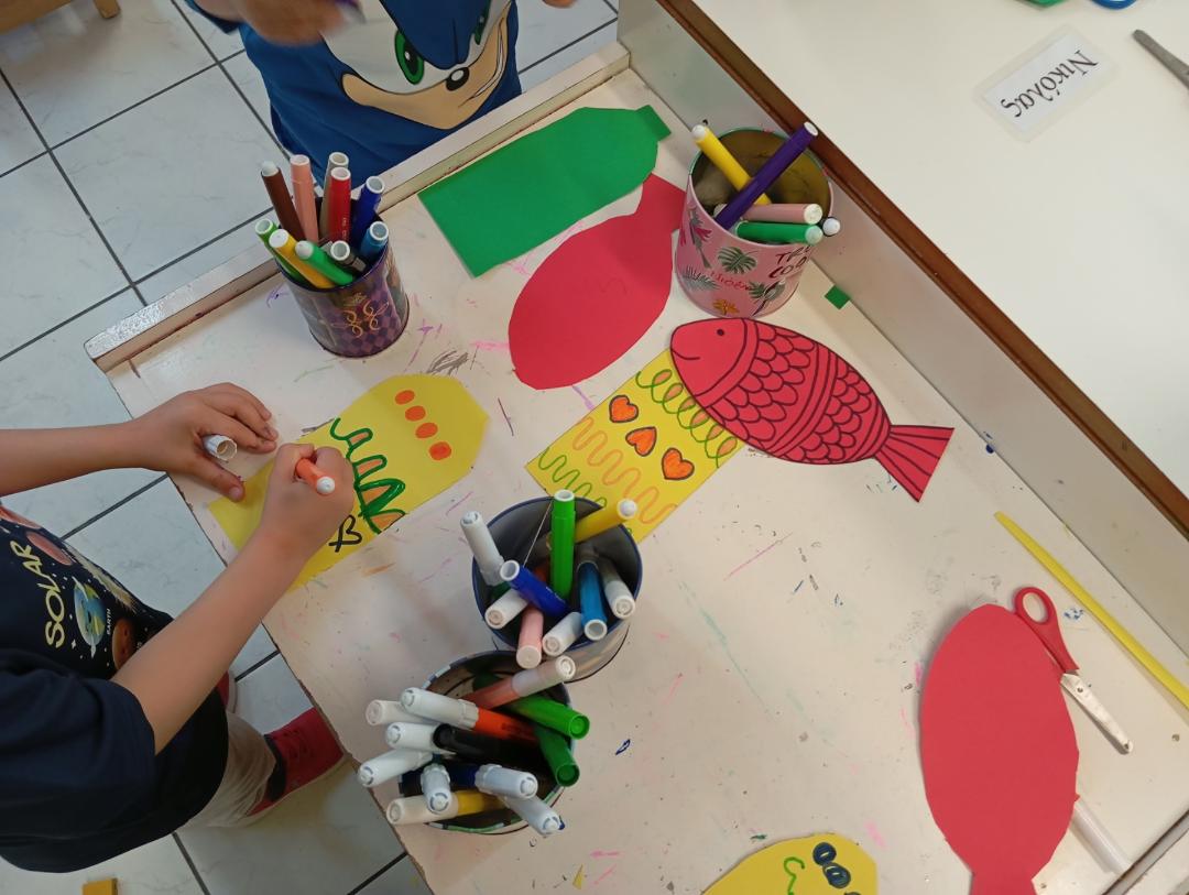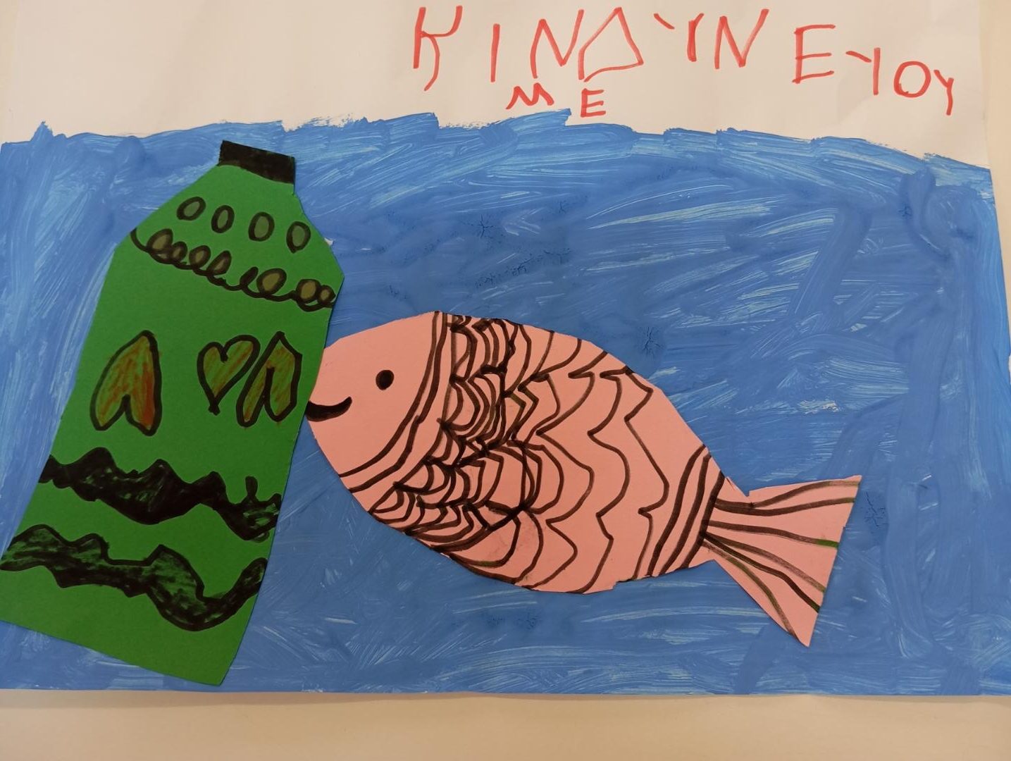 Η ιστορία μιλούσε για τα ψάρια που μπερδεύτηκαν κι έφαγαν τα πλαστικά μπουκάλια. Έτσι, αποφασίσαμε να αναπαραστήσουμε την εικόνα της ιστορίας στο χαρτί.