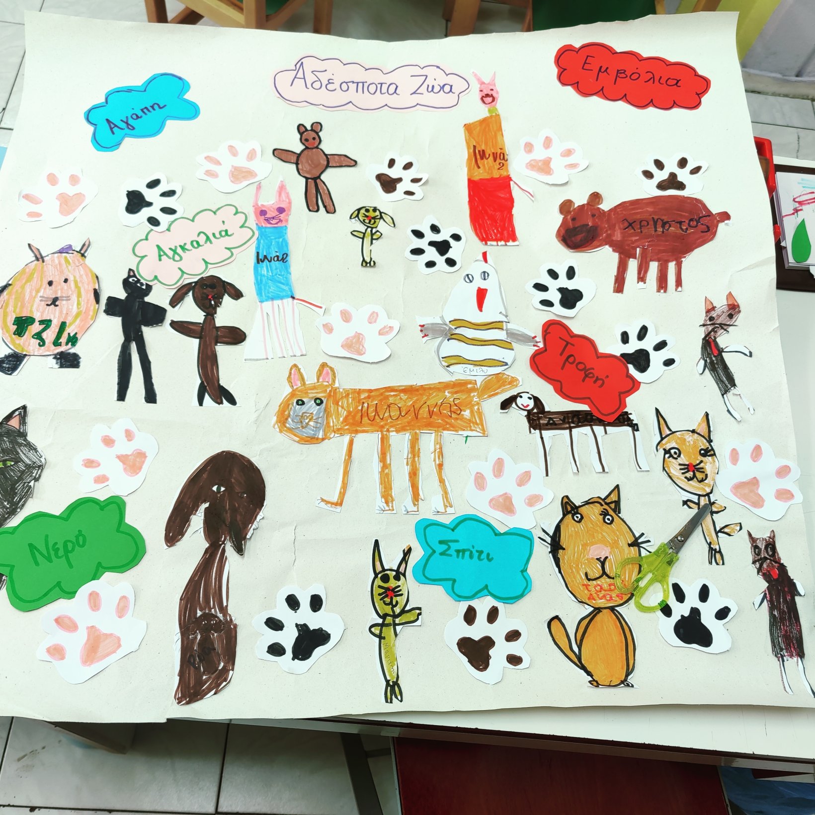 Τα παιδιά είδαν φωτογραφίες από Καταφύγιο Αδέσποτων Ζώων, τις παρατήρησαν και προβληματίστηκαν προτείνοντας τρόπους με τους οποίους μπορούμε όλοι να συμβάλουμε στην προστασία και τη φροντίδα τους.