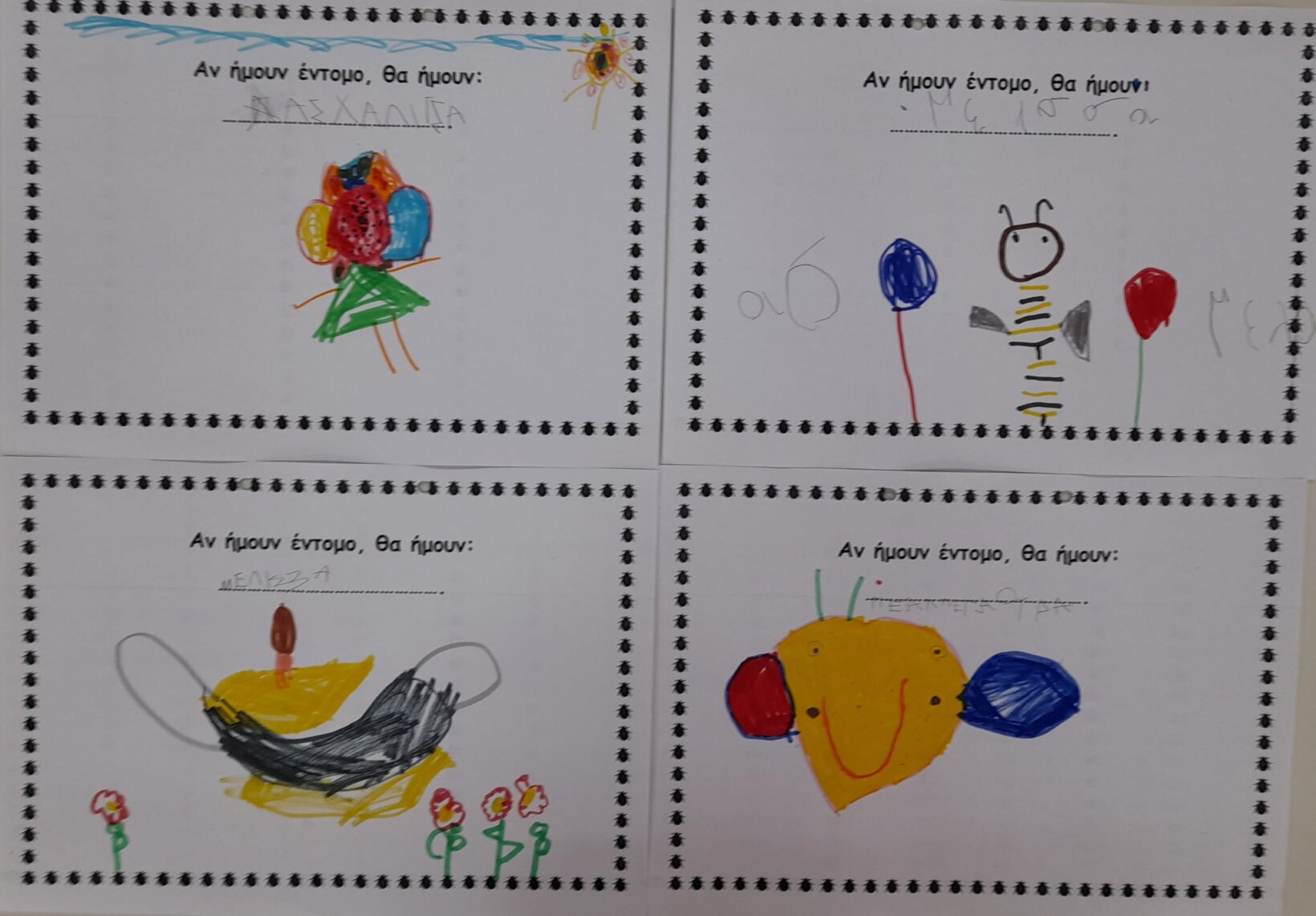 -Φτιάχνω ένα αίνιγμα – μάντεψε τι είναι: ο ενήλικας (μαμά, μπαμπάς..) φτιάχνει αυτοσχέδια αινίγματα-περιγραφές εντόμων(δίνοντας ξεκάθαρη περιγραφή για το έντομο που έχει στο μυαλό του) και παροτρύνει το παιδί να βρει πιο έντομο είναι.