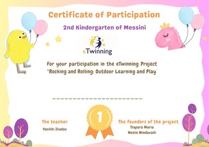 Τα παιδιά του Νηπιαγωγείου μας συμμετείχαν στο Ευρωπαϊκό Πρόγραμμα eTwinning “Rocking and Rolling: Outdoor Learning and Play”. Στη δράση συμμετείχαν 12 σχολεία από την Ελλάδα, την Τουρκία, την Κροατία και τη Ρουμανία.
