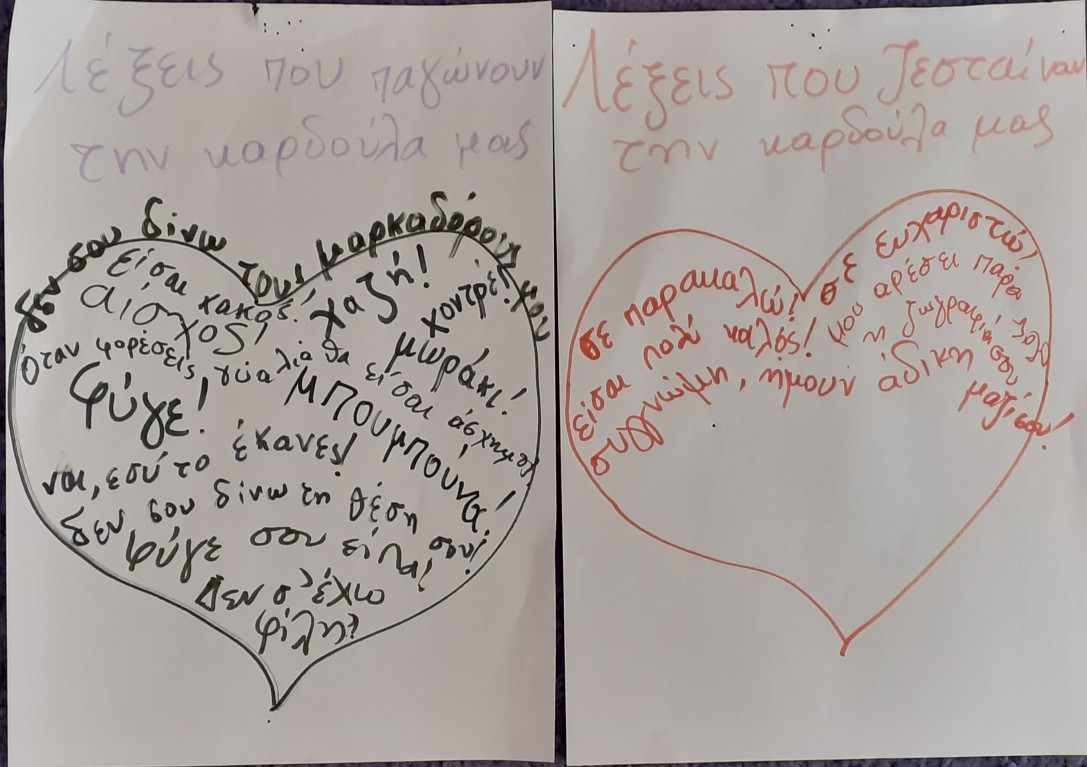 Στα πλαίσια του προγράμματος της σχολικής μας μονάδας “Φίλος Φίλευε τον Φίλο Τριαντάφυλλο με Φύλλο” αποφασίσαμε στο Συμβούλιο της Τάξης να ζωγραφίσουμε 2 καρδούλες και να καταγράψουμε σε μία εβδομάδα τις λέξεις και εκφράσεις που είπαμε ο ένας στον άλλον μέσα στο σχολείο. Λέξεις και εκφράσεις που ζεσταίνουν την καρδούλα μας ή την παγώνουν.