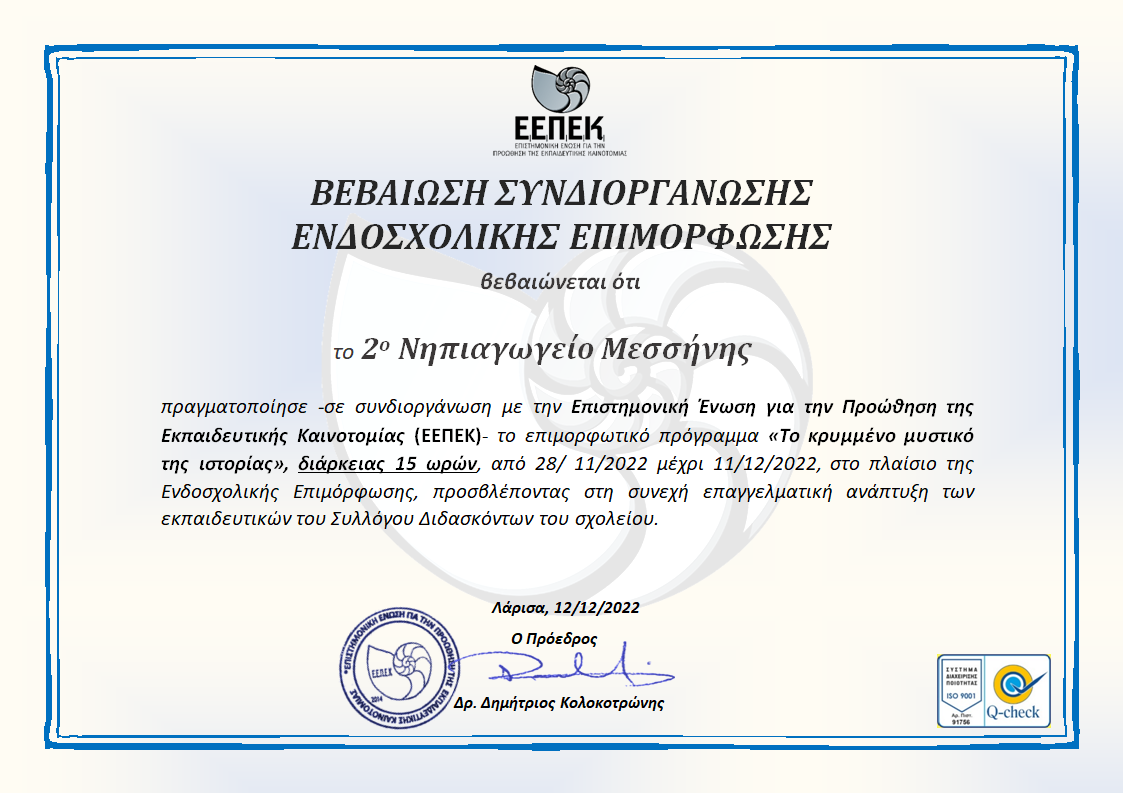 Το σχολείο μας ολοκλήρωσε επιτυχώς το Επιμορφωτικό Πρόγραμμα της Ε.Ε.Π.Ε.Κ. (Επιστημονική Ένωση για την Προώθηση της Εκπαιδευτικής Καινοτομίας) “Το κρυμμένο Μυστικό της Ιστορίας”, διάρκειας 15 ωρών, από 28/11/2022 έως 11/12/2022, στα πλαίσια της διαρκούς επιμόρφωσης των εκπαιδευτικών της μονάδας μας.