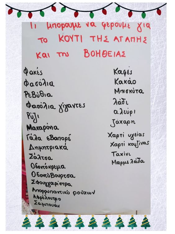 Λίγες μέρες απομένουν μέχρι τα Χριστούγεννα και μαζί με τα παιδιά αποφασίσαμε να δείξουμε την αγάπη μας σε οικογένειες που δυσκολεύονται να καλύψουν τις βασικές ανάγκες των παιδιών τους. Η φιλανθρωπική αυτή δράση γίνεται στα πλαίσια του εργαστηρίου δεξιοτήτων για τα δικαιώματα των παιδιών με στόχο την ευαισθητοποίηση των μαθητών μας στα κοινωνικά προβλήματα που υπάρχουν γύρω μας.