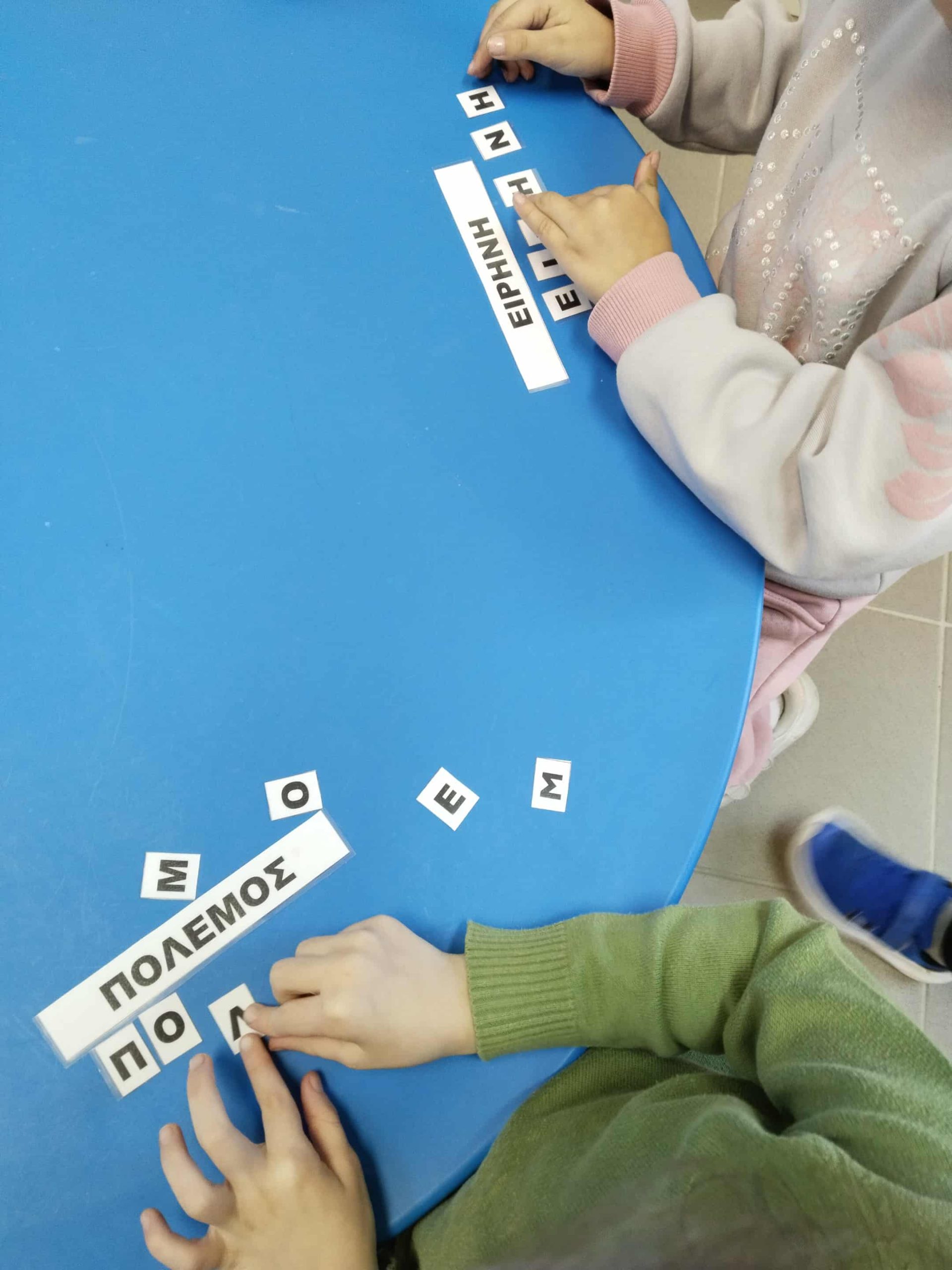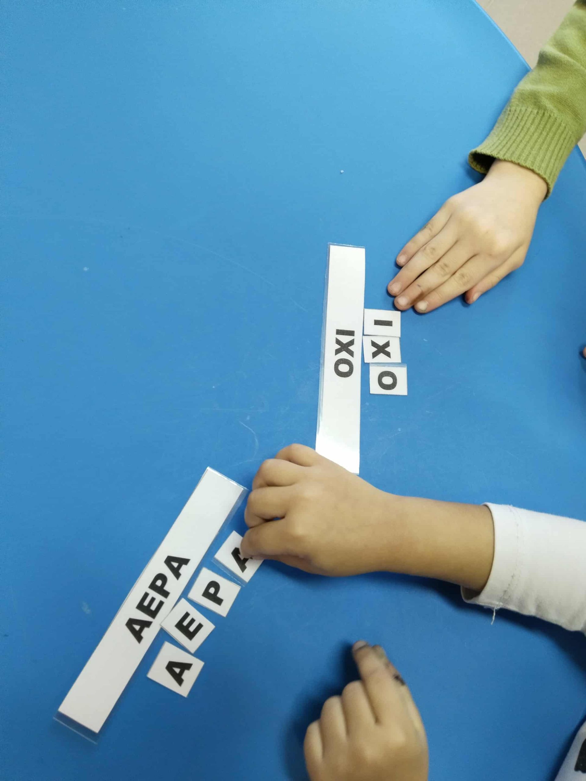 Πάνω σε χρωματιστά χαρτόνια κόλλησαν κομματάκια εφημερίδας φτιάχνοντας τα γράμματα των λέξεων «ΕΧΩ ΔΙΚΑΙΩΜΑ»… τα έβαλαν στη σωστή σειρά…παρατάχτηκαν με αυτά..