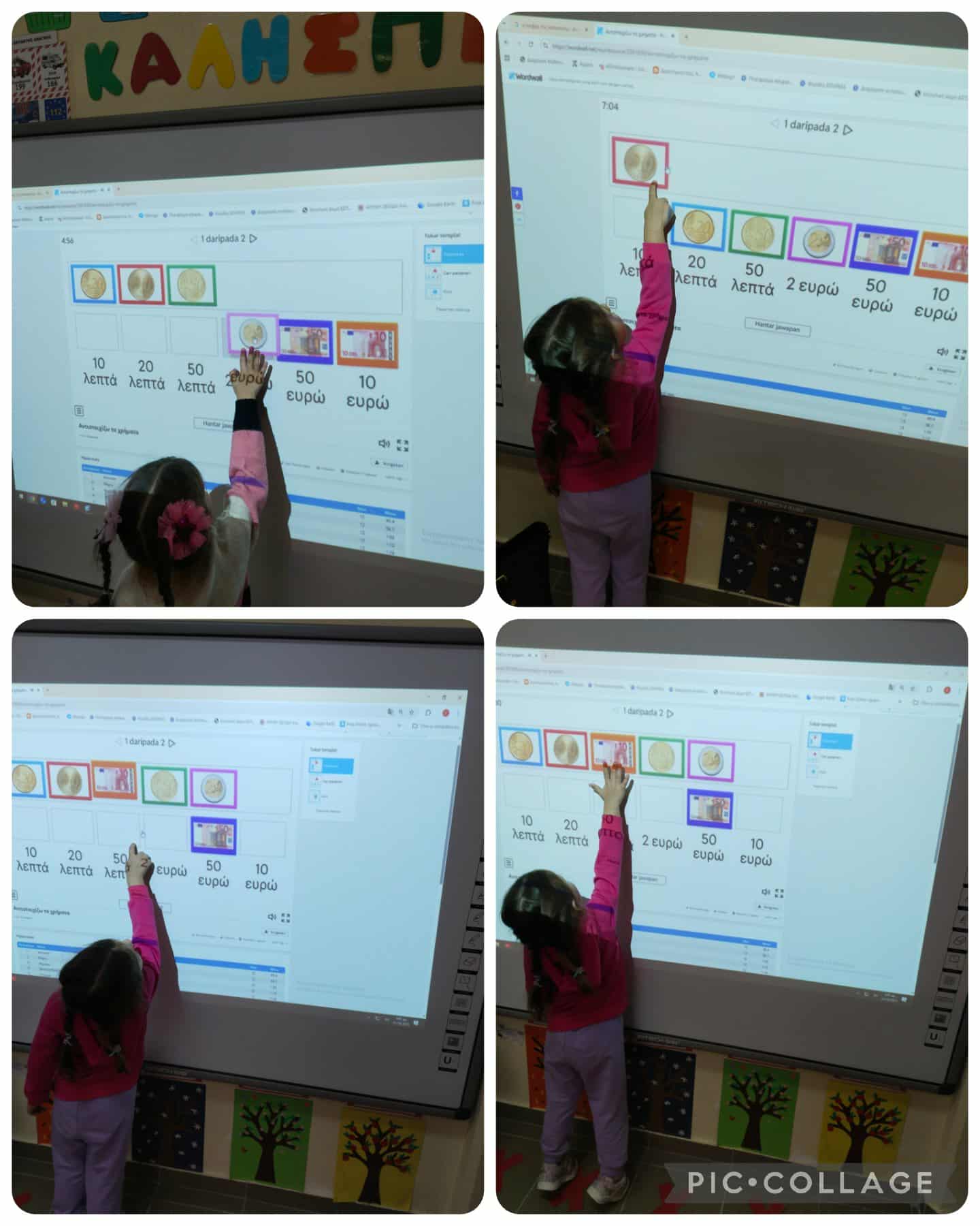 Έπαιξαν το παιχνίδι του τραπεζίτη, όπου έπρεπε να αντιστοιχίζουν το χαρτονόμισμα ή το κέρμα με το αντίστοιχο καρτελάκι…..και στον διαδραστικό πίνακα..