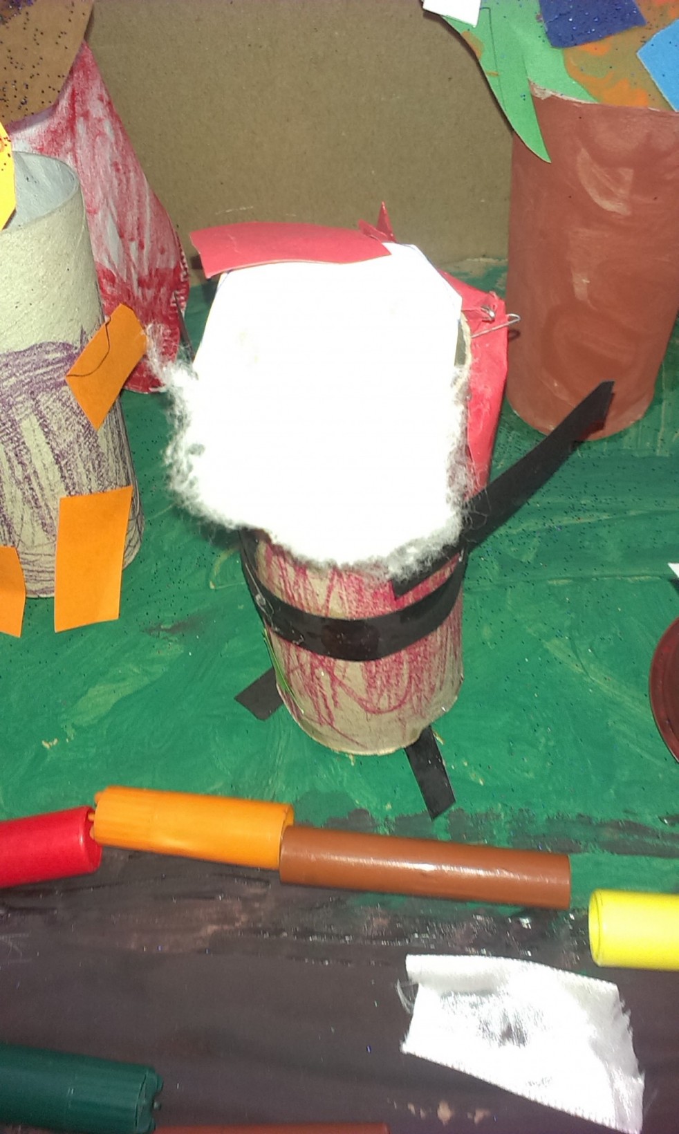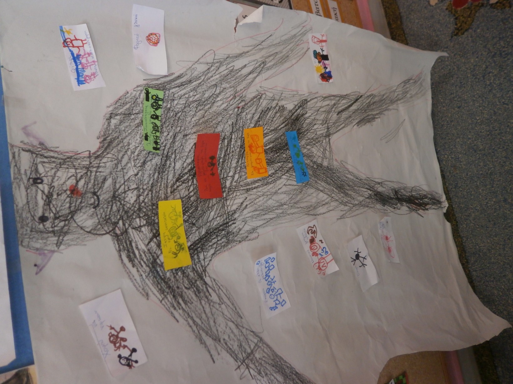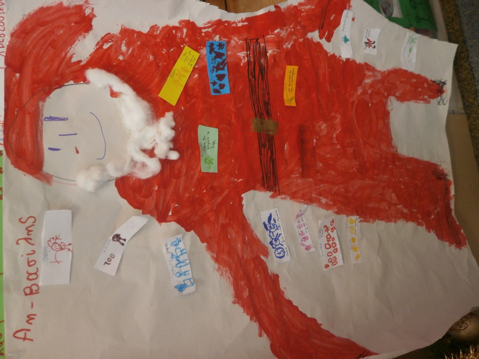 Στο πλαίσιο της επεξεργασίας των ρόλων του θεατρικού μας εφαρμόσαμε την θεατρική τεχνική του ρόλου στον τοίχο. Κάναμε το περίγραμμα των χαρακτήρων του Αι-Βασίλη και του καλικάντζαρου σε χαρτί μέτρου και το κολλήσαμε στον τοίχο. Σε μικρές ομάδες αποδώσαμε διάφορα χαρακτηριστικά γνωρίσματα του κάθε ήρωα.