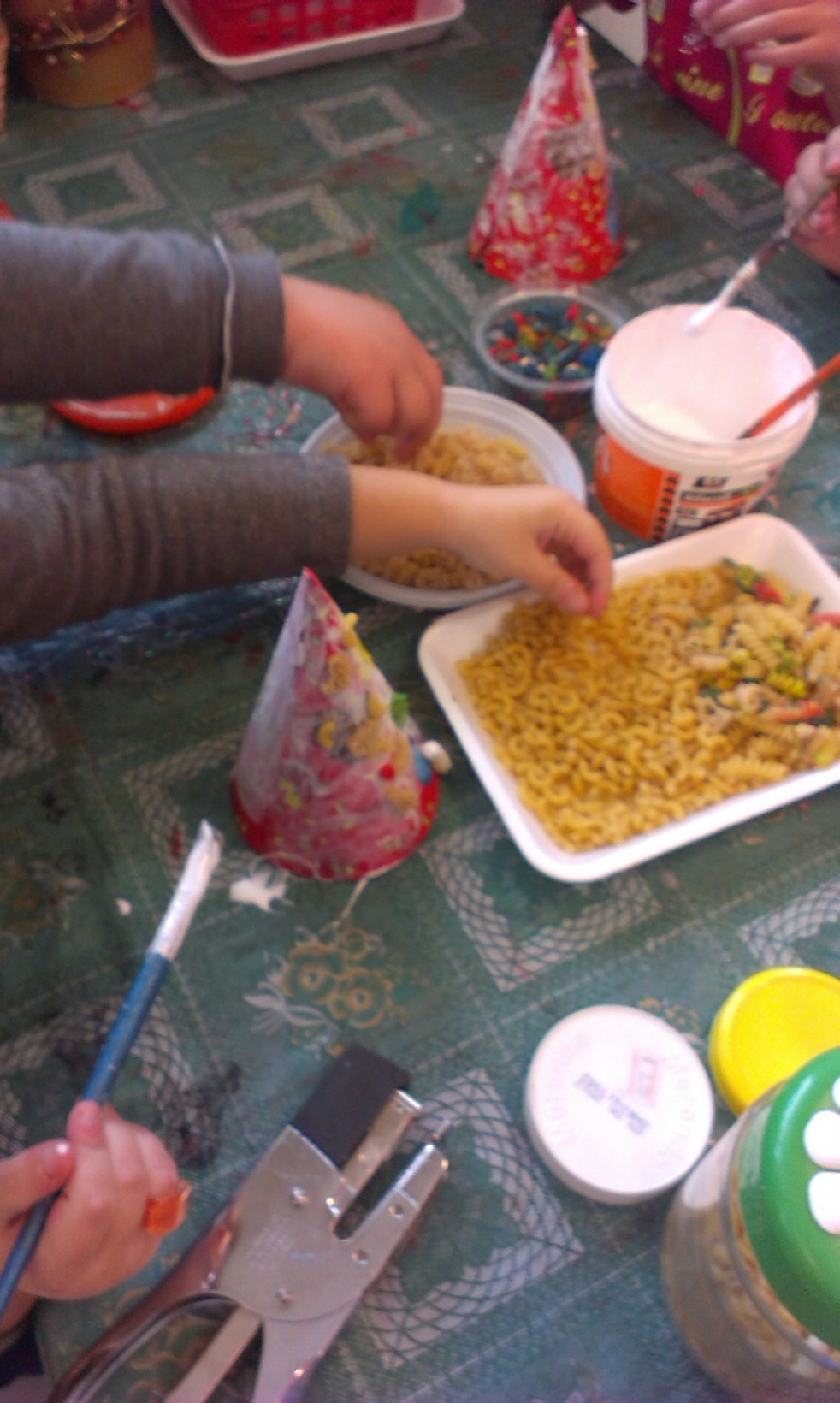 - Βρήκαμε πολλά καπέλα για πάρτι και σκεφτήκαμε να φτιάξουμε δεντράκια. Μετά από συζήτηση αποφασίσαμε να κολλήσουμε μακαρονάκια πάνω. Έτσι αρχίσαμε δράση: