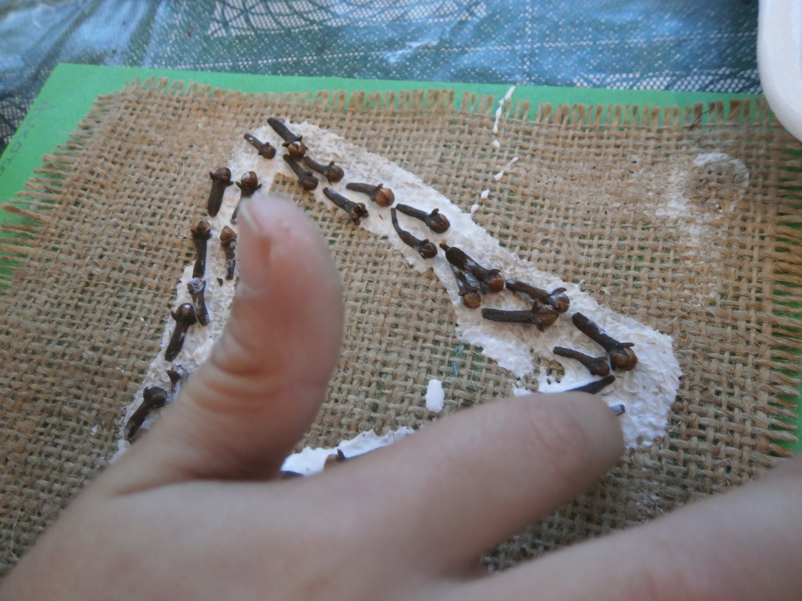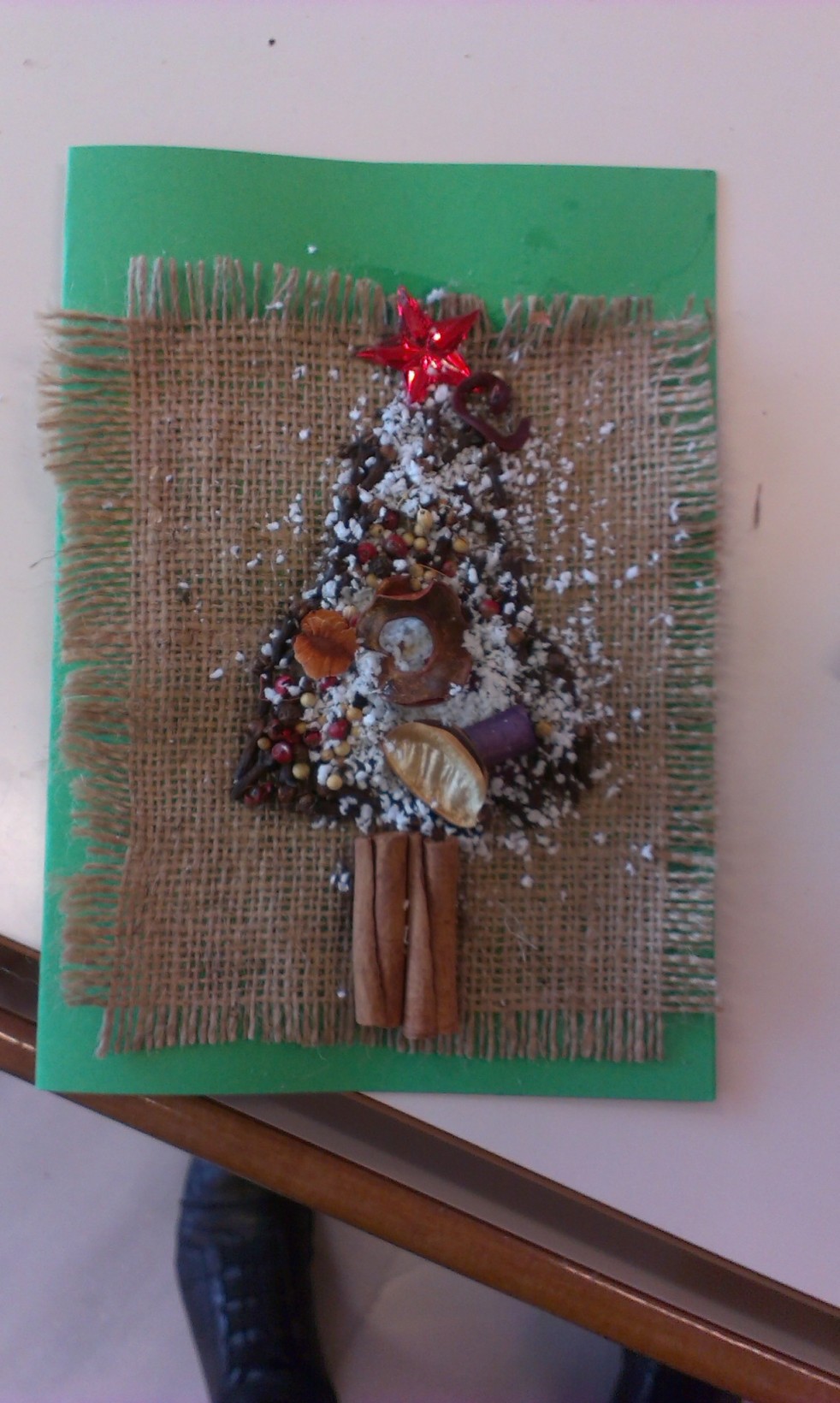- Tην κάρτα μας διαλέξαμε να την φτιάξουμε με μπαχαρικά και άλλα υλικά.(μοσχοκάρυδο, κανέλα) Κόψαμε λινάτσα και την κολλήσαμε πάνω σε πράσινο χαρτόνι.