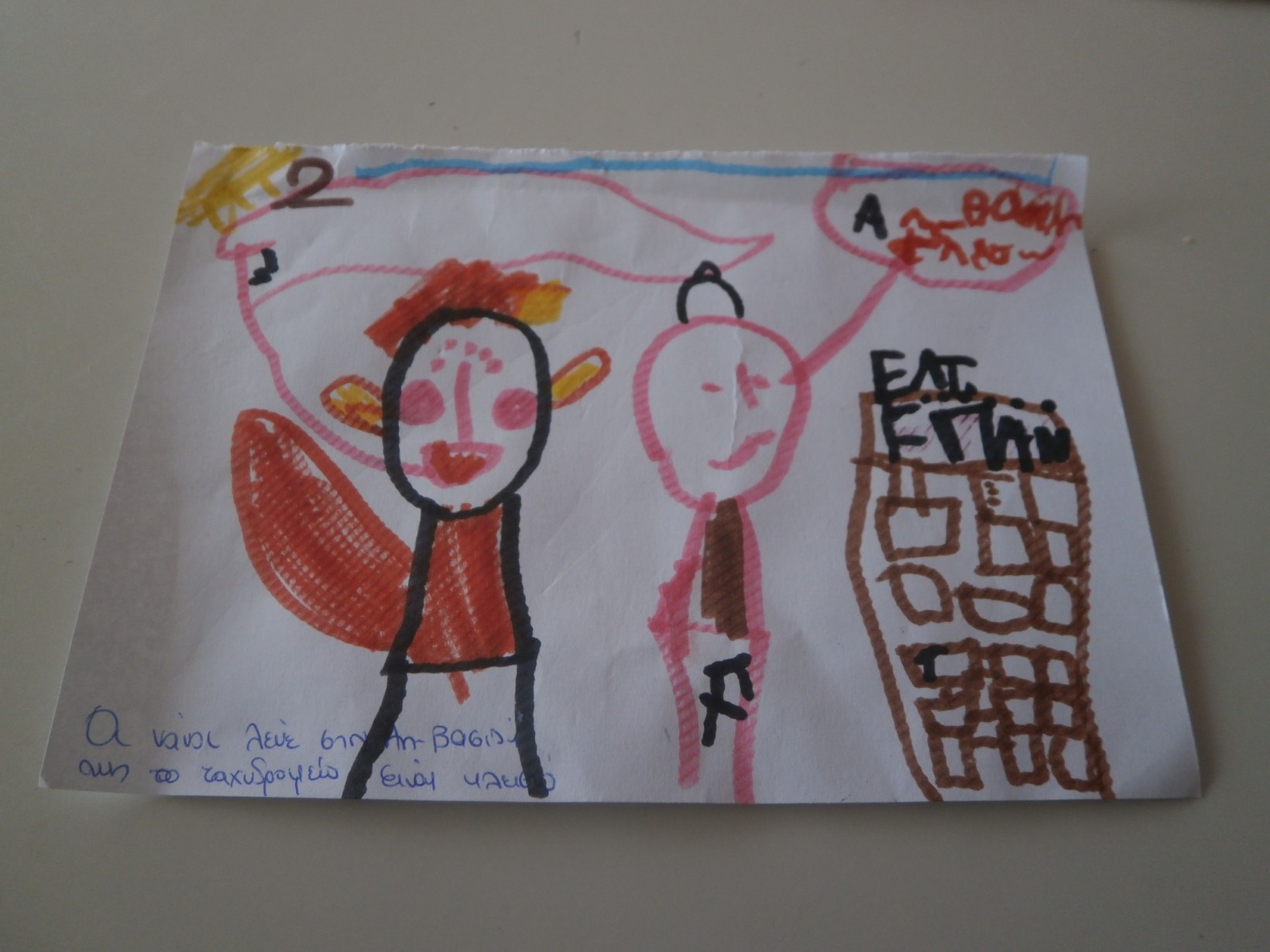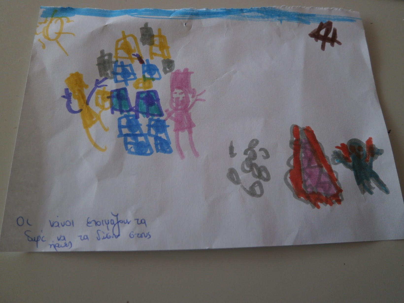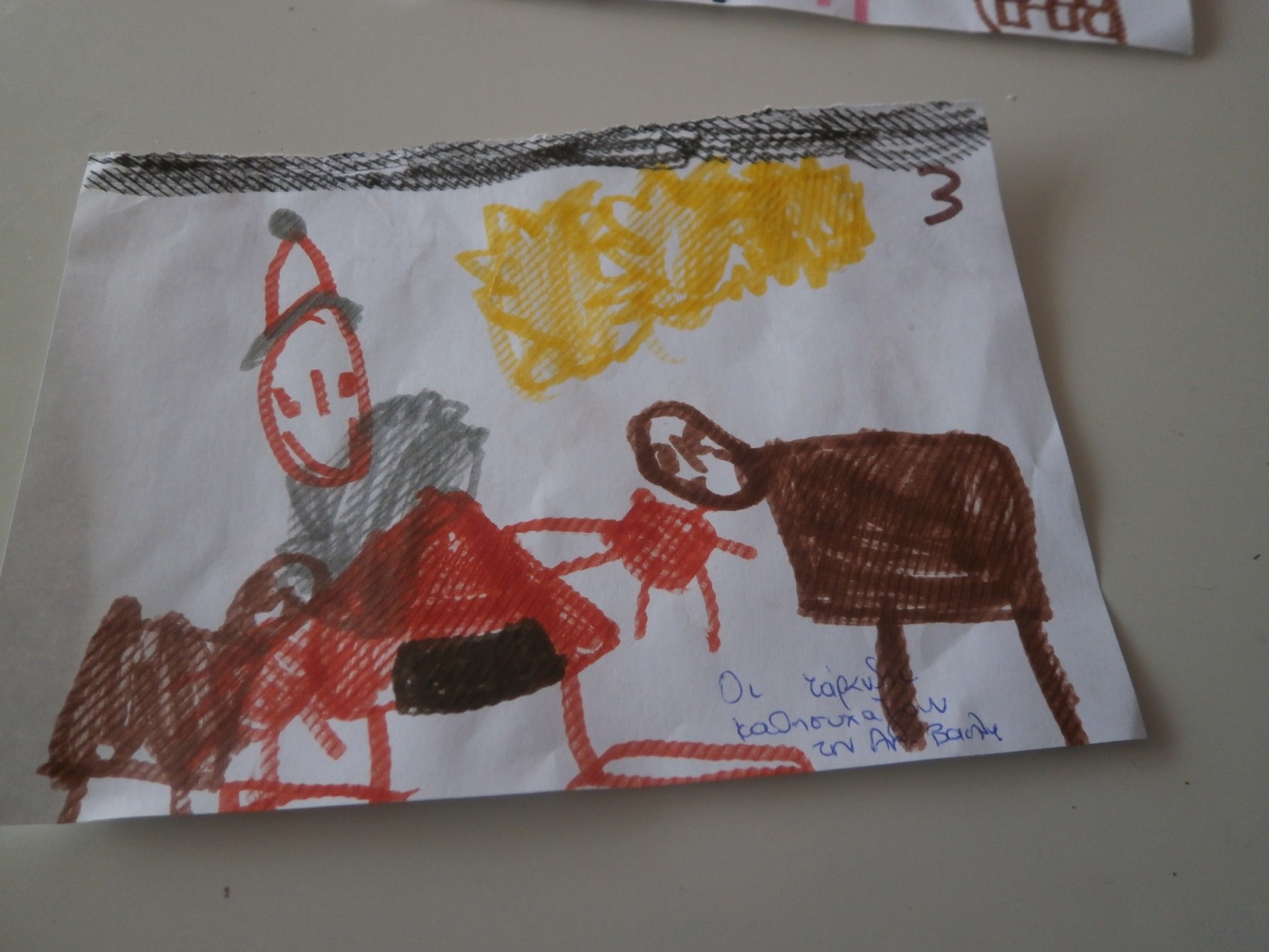 Ξαναφτιάξαμε και αναδιηγηθήκαμε την ιστορία μας ,αφού πρώτα σε μικρές ομάδες ζωγραφίσαμε τις σκηνές της ιστορίας, τις αριθμήσαμε τις βάλαμε στη σειρά και τις ζωντανέψαμε, ανακαλύπτοντας τα αντικείμενα και τους ήχους της.Μετά ζωγράφισαν σε ομάδες την ιστορία, βάζοντας με την σειρά τις ζωγραφιές τους.