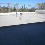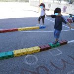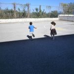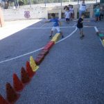 Στην αυλή του σχολείου μας γυμναστήκαμε κάνοντας αγώνες, τρέχοντας ,πετώντας την μπάλα πιο μακρυά,πηδώντας κορίνες ,περπατώντας σε εμπόδια κλπ.
