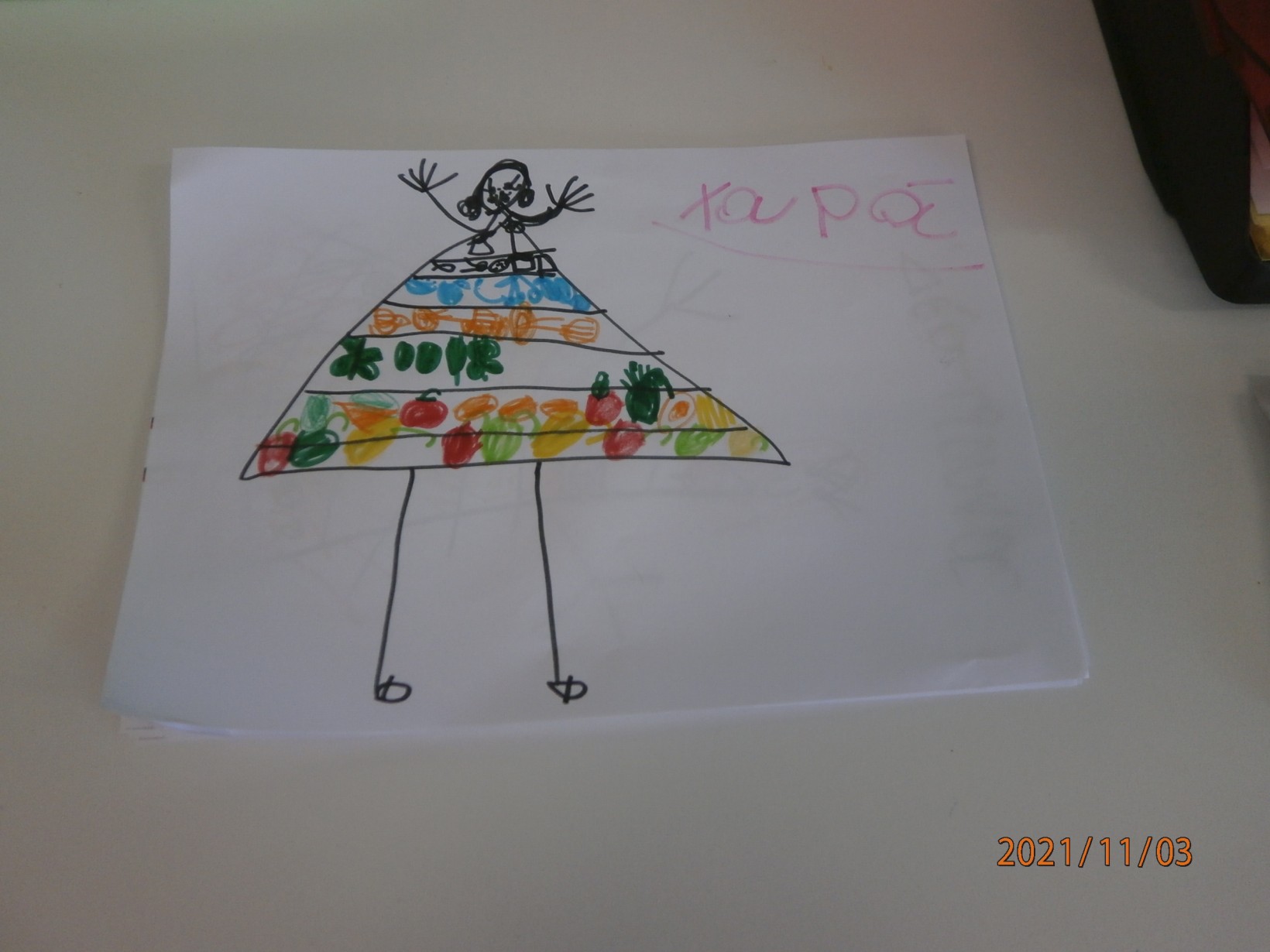 Ζωγράφισαν την πυραμίδα της διατροφής στην κ Διατροφούλα(τα νήπια ζωγράφισαν μόνα τους και τα προνήπια πάνω σε φωτοτυπημένη κ διατροφή ζωγράφισαν τροφές από τις βασικές) ομάδες)