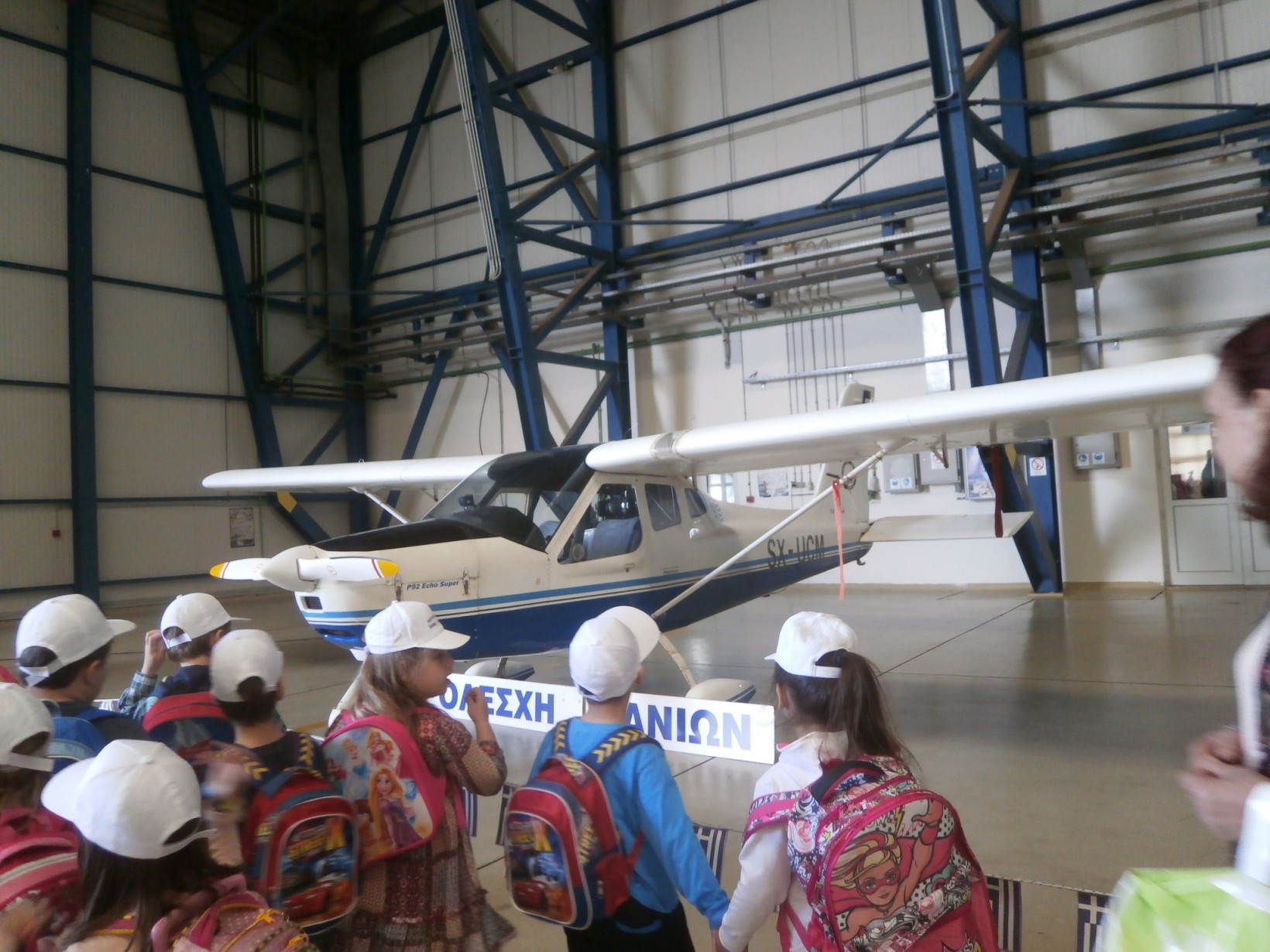Εκεί ξεναγηθήκαμε στην αίθουσα που είχαν τα αεροπλάνα για το κοινό και από τον κύριο Μάνο τον πιλότο. Ανεβήκαμε και είδαμε από κοντά το πιλοτήριο ενός πολεμικού αεροπλάνου.