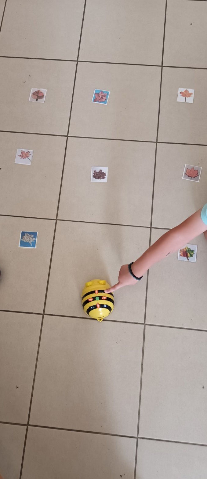 5η δραστηριότητα: Παίξαμε με το ρομποτάκι .Τα παιδιά το οδήγησαν να περάσει σε διαδρομή ανάμεσα από τα φύλλα ή πάνω από αυτά και να σταματήσει όταν φτάσει στο δικό μας φύλλο.