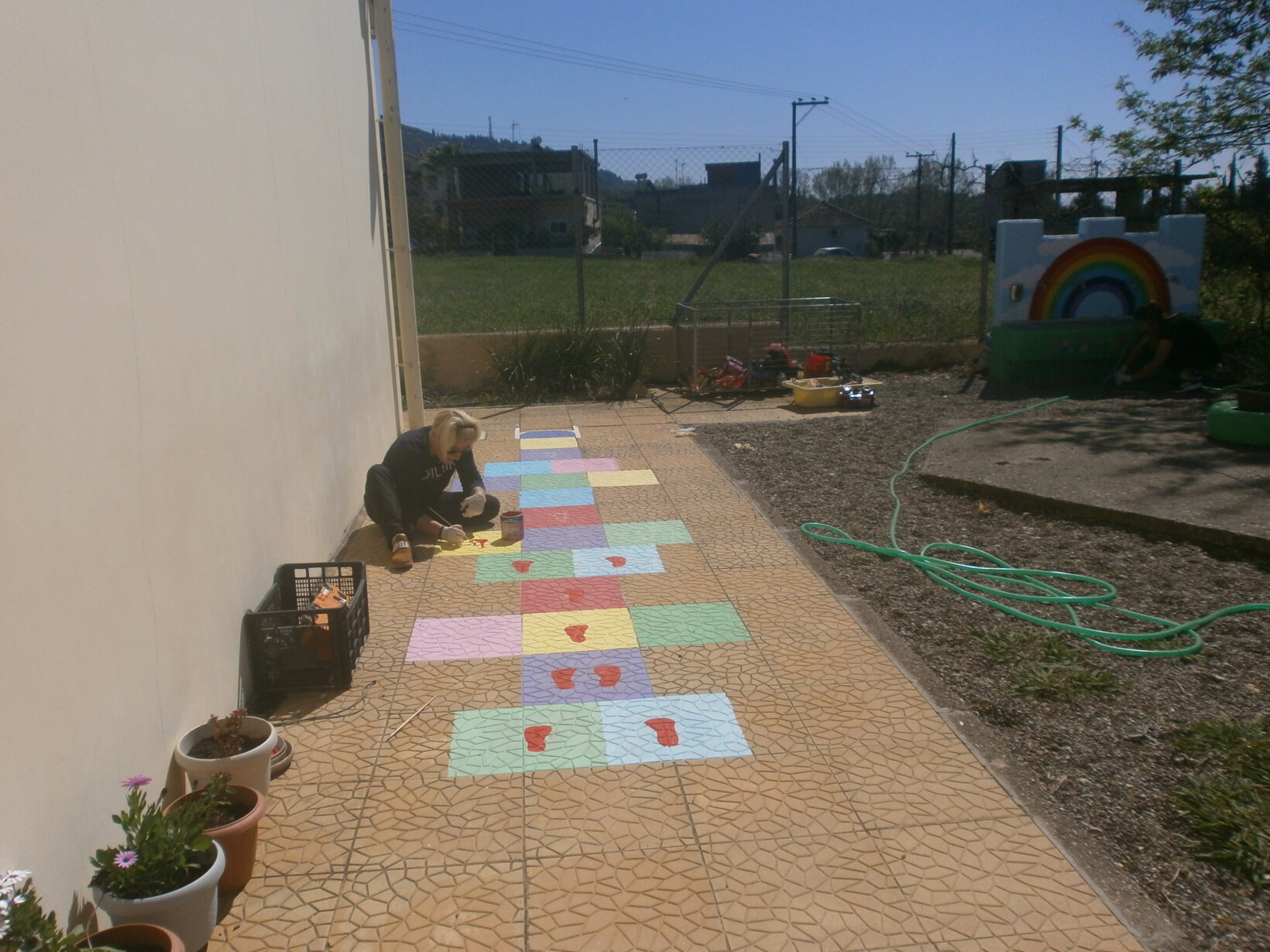 -Σχεδιασμός και βάψιμο επιδαπέδιων παιχνιδιών στην αυλή μας με την ενεργό συμμετοχή των εκπαιδευτικών και γονέων .