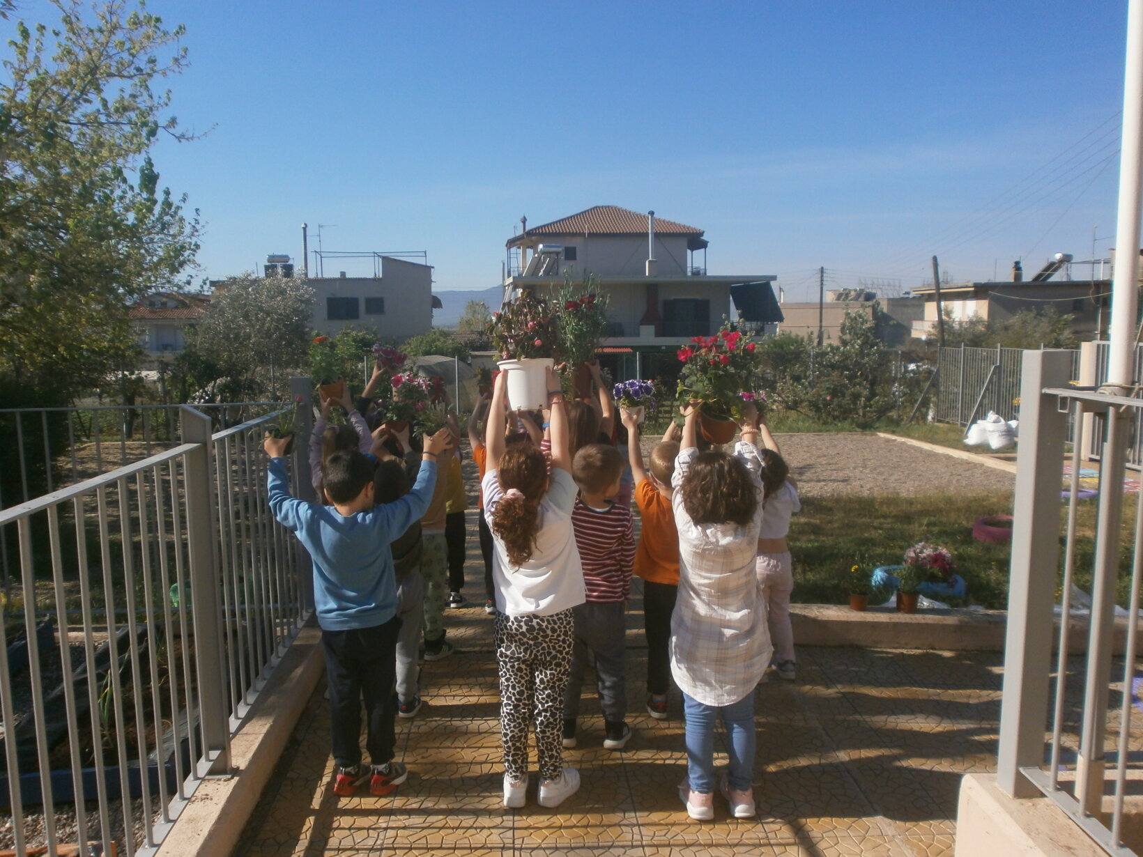 -Φύτεμα καλλωπιστικών φυτών- για τη δημιουργία του ανθόκηπου-δωρεά των γονέων, από τους μικρούς κηπουρούς μας, με τη βοήθεια των εκπαιδευτικών του σχολείου μας. Η ενθουσιώδης διάθεση των μικρών μαθητών μας έχει ως αποτέλεσμα την ενεργό συμμετοχή τους και καθημερινή φροντίδα της “νέας μας αυλής”.