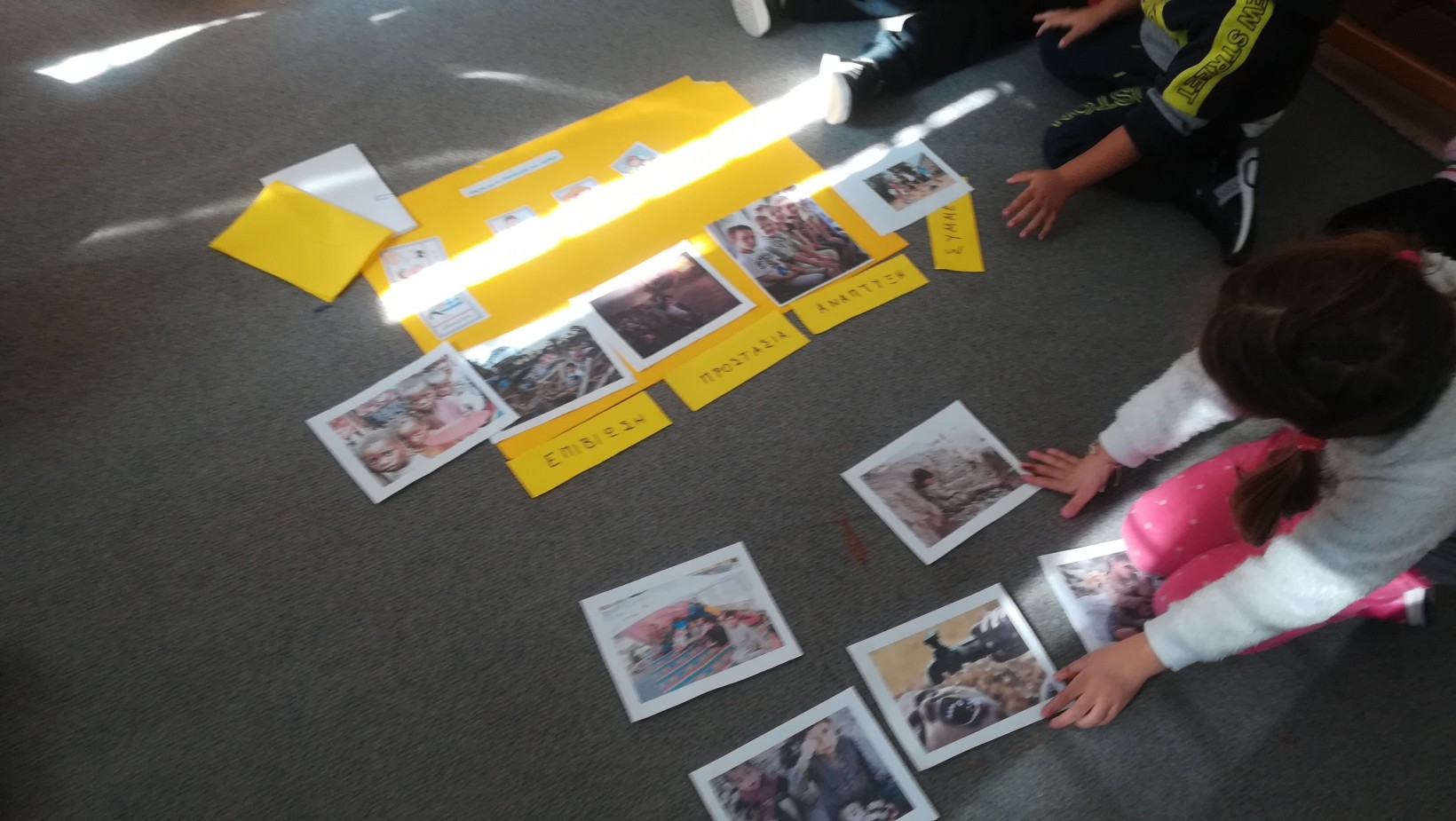 Τα παιδιά στο πρώτο μάθημα μέσω παιχνιδιού χωρίστηκαν πάλι σε δυάδες και έπρεπε να διαλέξουν μια εικόνα απο τα τραπεζάκια ο καθένας οι οποίες έδειχναν καταστάσεις προβληματικές παιδιών άλλων χωρών που δεν έχουν να καλύψουν τις βασικές τους ανάγκες.