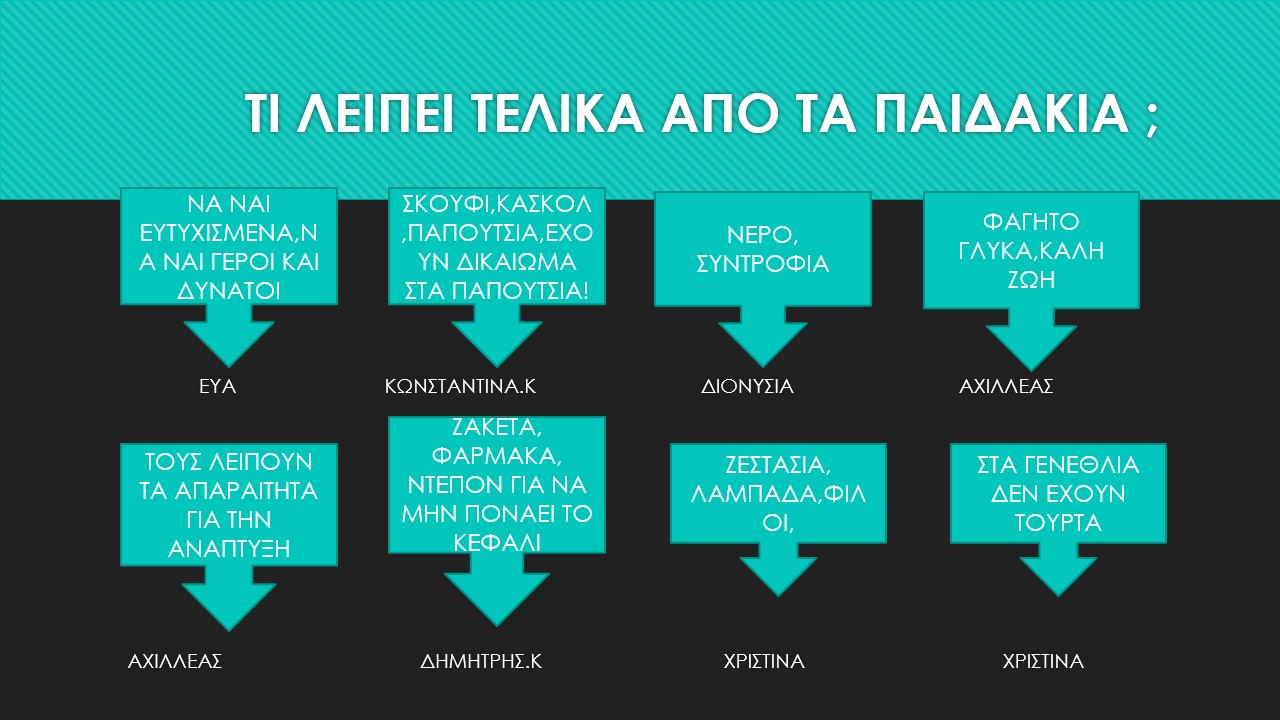 Στη συνέχεια τα παιδιά αποτύπωσαν με την ζωγραφική τις ανάγκες. με το ερώτημα: ”Τι θα έδινες σε αυτά τα παιδάκια;”
