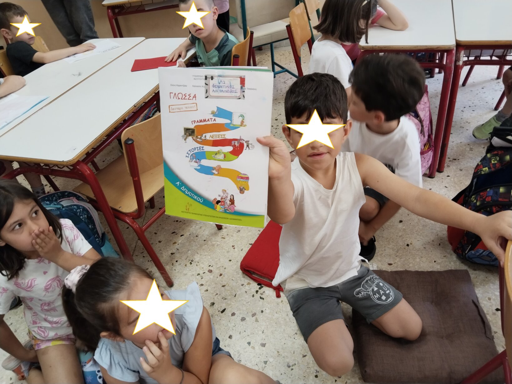 Αφού μπηκαμε στην τάξη θέσαμε τις ερωτήσεις και οι μαθητές/τριες της Α Δημοτικού απαντόυσαν στους μαθητές/τριες του Νηπιαγωγείου δείχνοντας τα μαθήματά τους στο τέλος .