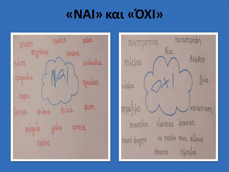 Αφορμή για την συζήτησή μας ήταν το μεγαλειώδες «ΟΧΙ» του Ιωάννη Μεταξά και των Ελλήνων απέναντι στον φασισμό και τον ναζισμό. Σκεφτήκαμε, συζητήσαμε και καταγράψαμε τις περιπτώσεις, που εμείς πρέπει να λέμε «ΟΧΙ» και «ΝΑΙ» στην καθημερινότητά μας.
