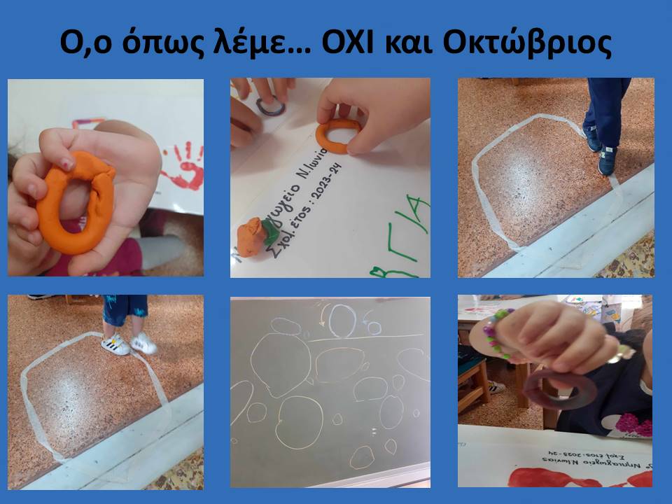 Γνωρίσαμε και την φωνούλα Ο, όπως λέμε ΟΧΙ και Οκτώβριος. Χρησιμοποιήσαμε τα δάχτυλα, τα χέρια, το στόμα και το σώμα μας για να το σχηματίσουμε και σκεφτήκαμε λέξεις που αρχίζουν και τελειώνουν με Ο.
